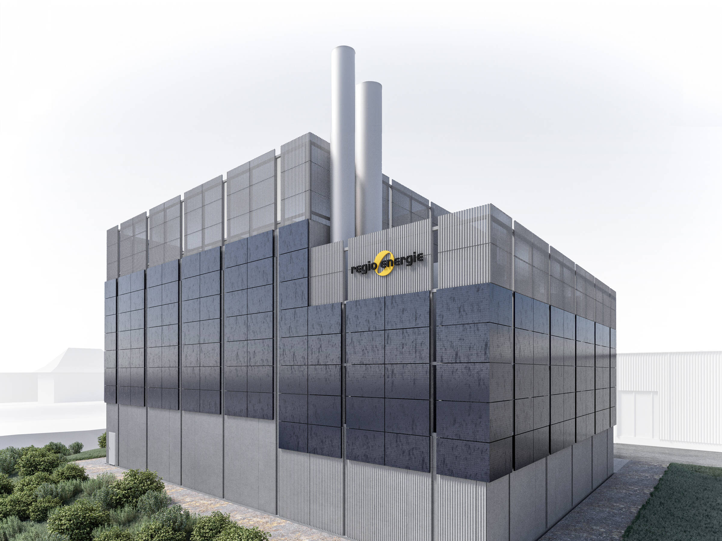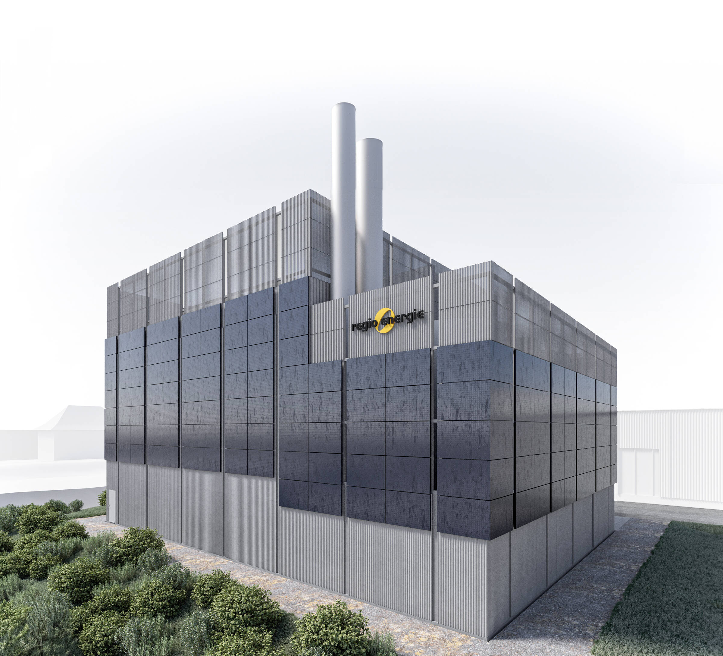 Damit der Energiehub seiner prominenten Lage Rechnung trägt, wird dem einfachen Betonkörper eine Stahlstruktur aufgesetzt. Diese gegliedert das Volumen und vermittelt Leichtigkeit. Den Vorbildcharakter und die Verantwortung der Regio Energie, welche sie im Rahmen der Energieversorgung für die Stadt Solothurn übernimmt, wird in Form von grossflächigen Photovoltaik-Modulen nach Aussen sichtbar gemacht.
