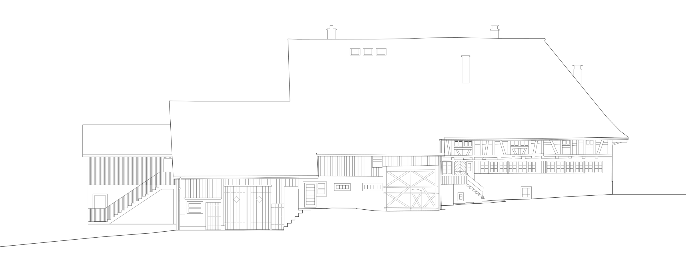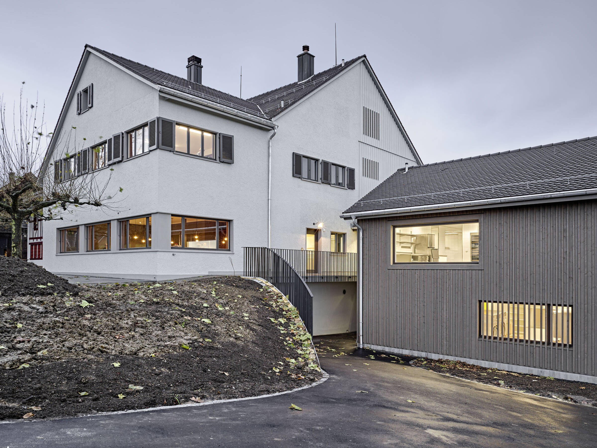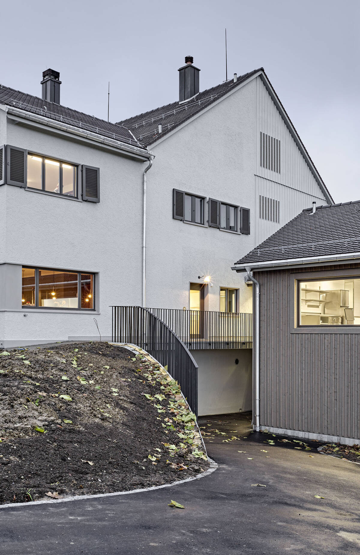 Das Konzept für den Neu- und Umbau war unter Einbezug der Umgebung auf die geschützte Bausubstanz abgestimmt. Der Anbau greift die vorherrschende Typologie der zusammenhängenden Dachlandschaft auf und fügt sich nahtlos in die bestehende Volumetrie des Ensembles ein.