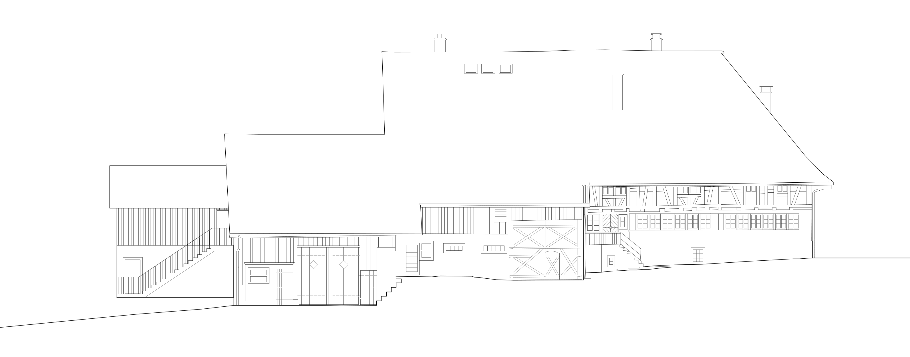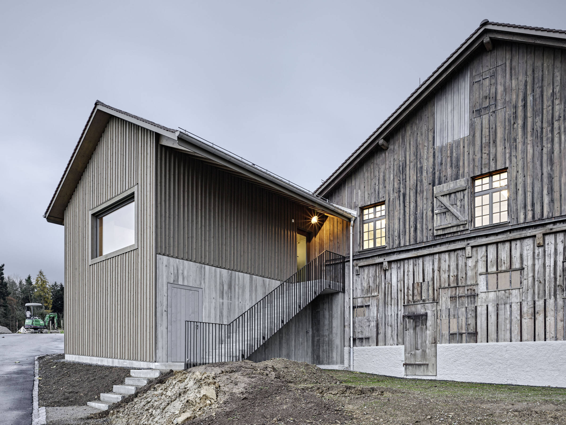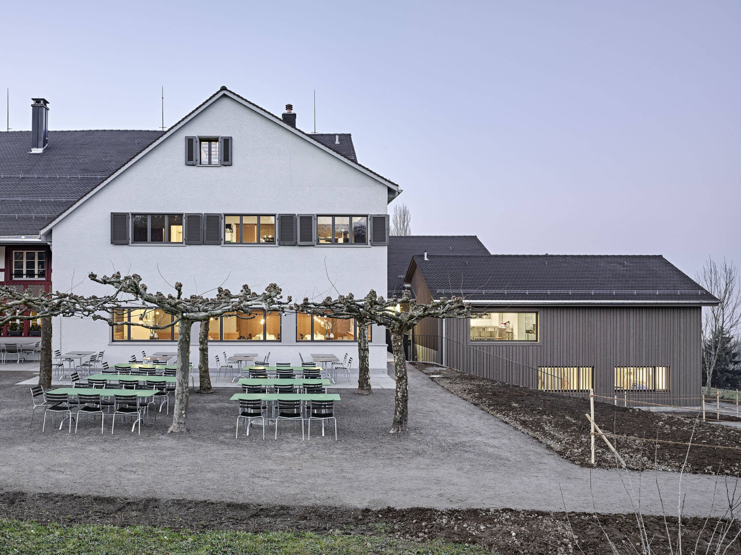Das Konzept für den Neu- und Umbau war unter Einbezug der Umgebung auf die geschützte Bausubstanz abgestimmt. Der Anbau greift die vorherrschende Typologie der zusammenhängenden Dachlandschaft auf und fügt sich nahtlos in die bestehende Volumetrie des Ensembles ein.