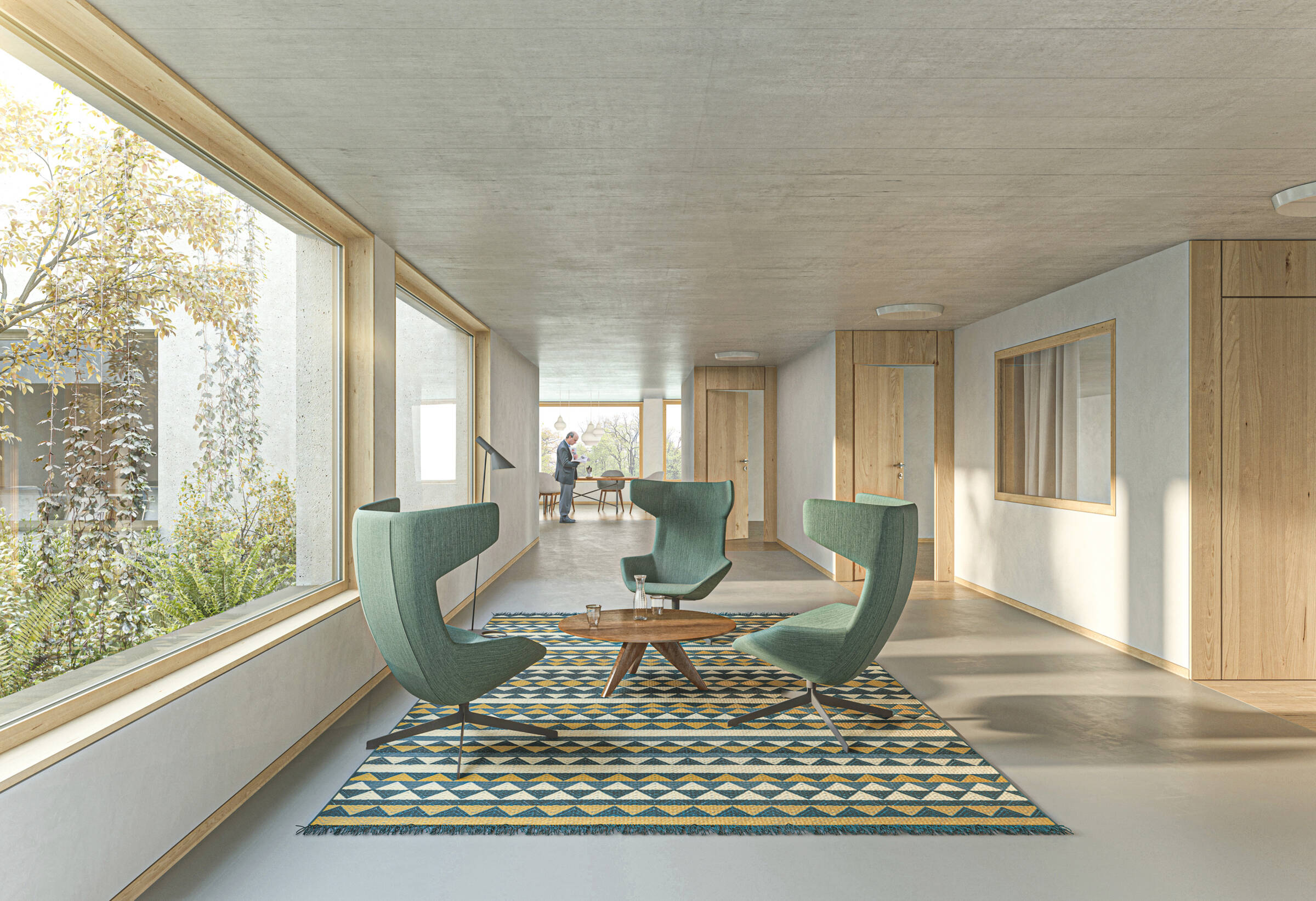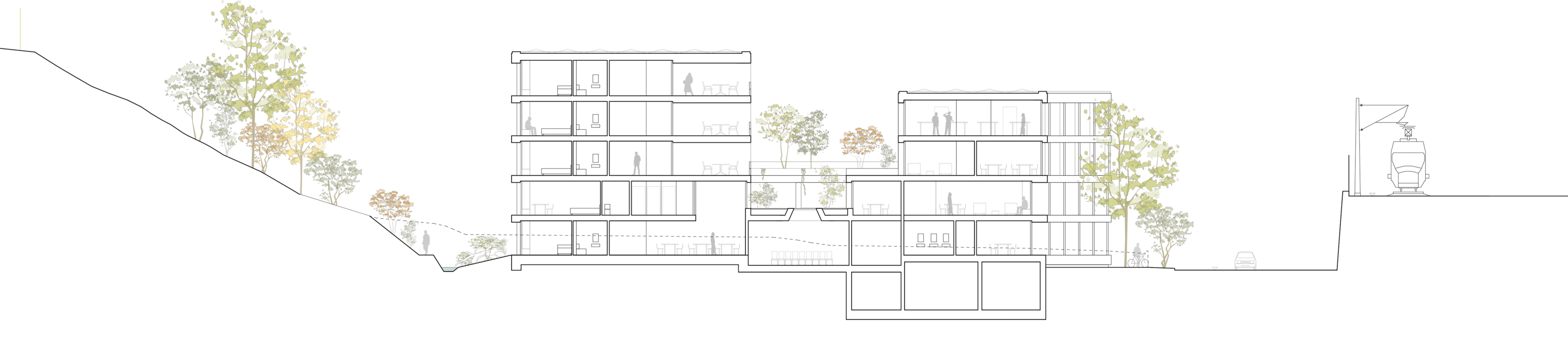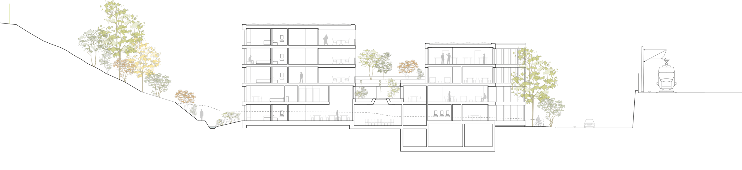 Zur Mitte übernehmen sie die Geometrie der inneren Gebäudeorganisation, welche die Ausrichtung der angrenzenden Bauten übernimmt und den Neubau im Gefüge verankert. Die differenzierte Ausformulierung in Höhe und Grösse verstärken die Auflösung des Gebäudes. Die Körnung der Hochbauten nimmt Bezug zur Umgebung und schafft trotz der stattlichen Baumasse eine städtebaulich verträgliche Situation.