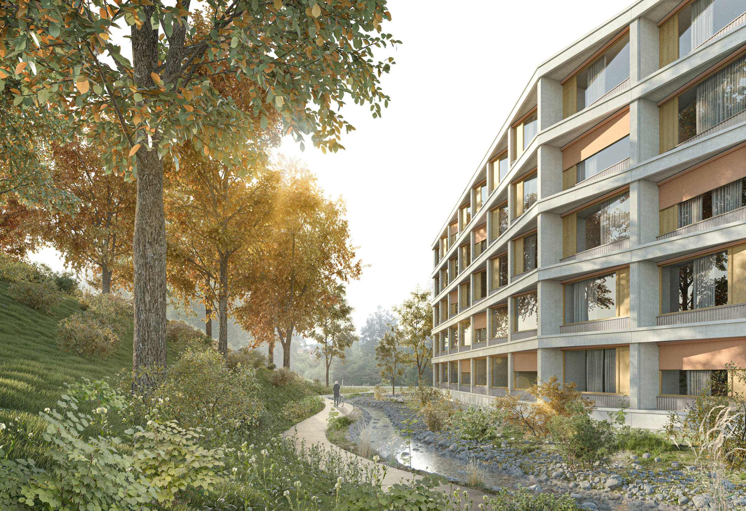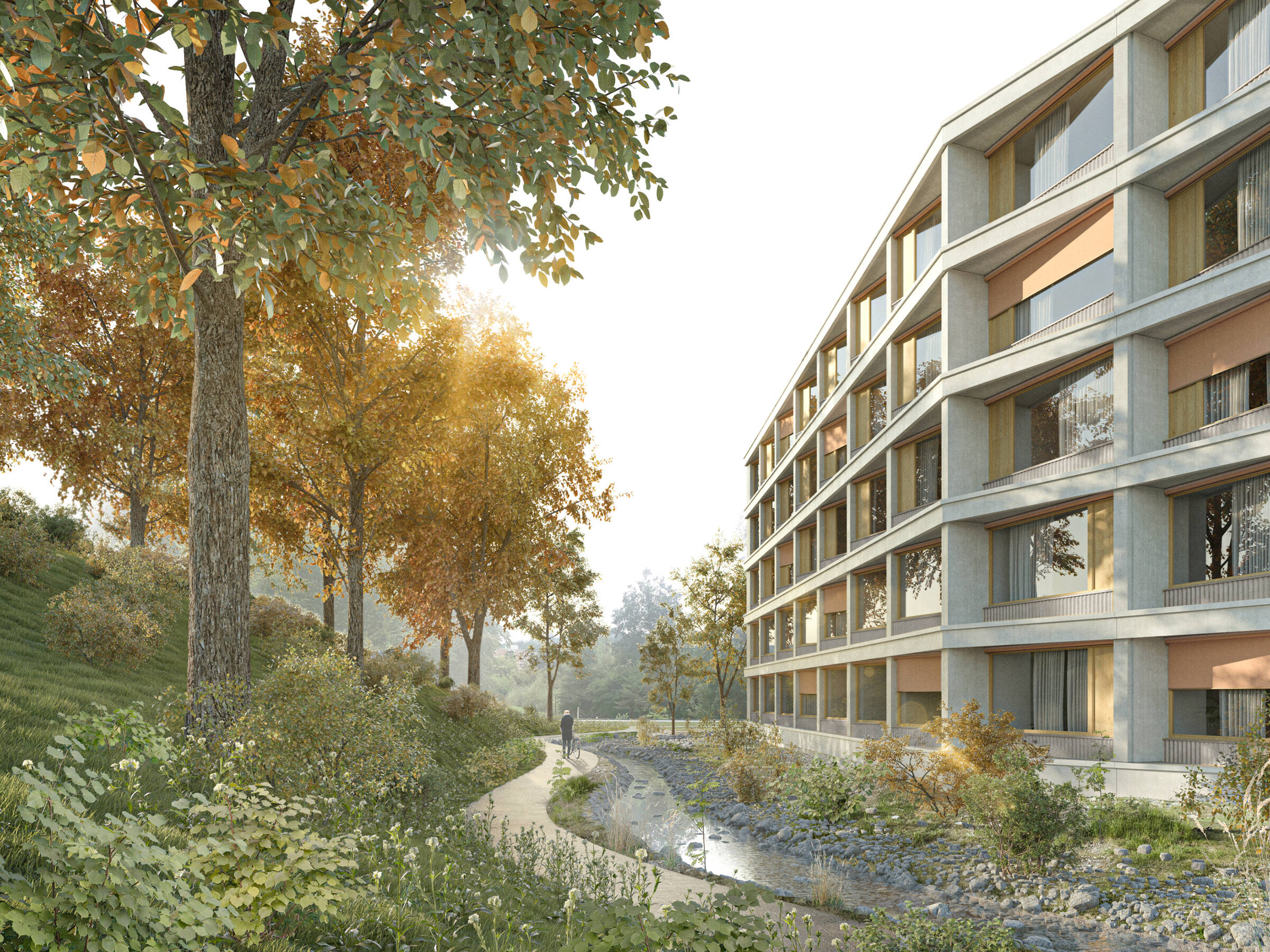 Der Aussenraum des Neubaus «inclusioplus» gliedert sich auf eine natürliche Art und Weise in die bestehende Umgebung der Psychiatrie Baselland ein. Wasser, als allgegenwärtiges Thema auf dem Campus und seiner Umgebung, wird durch die Ausdolung des Dietrichbrunnenbächlis wiederaufgegriffen und in seiner Identität und Präsenz gestärkt.