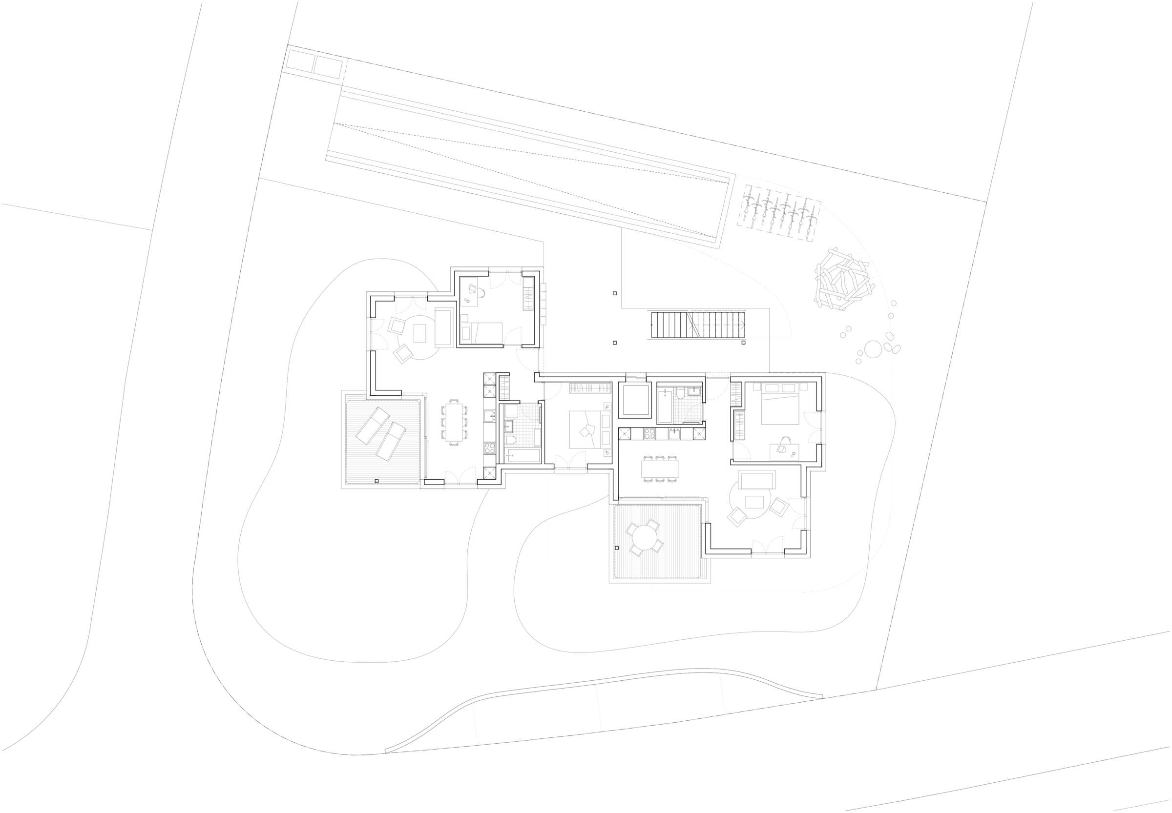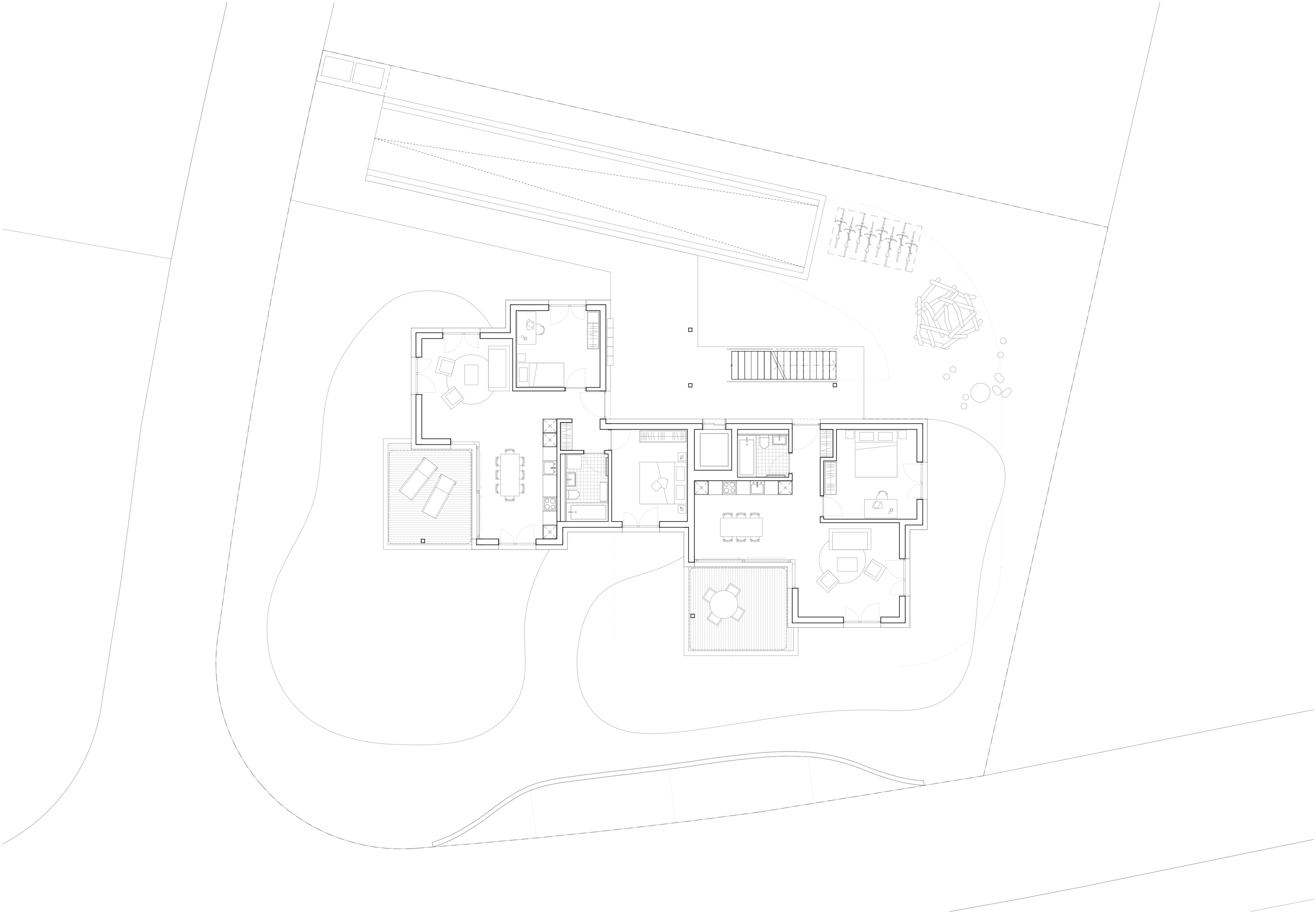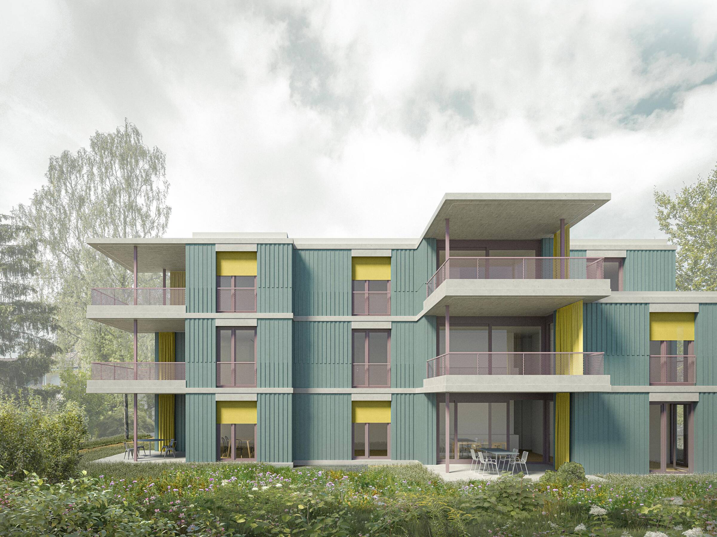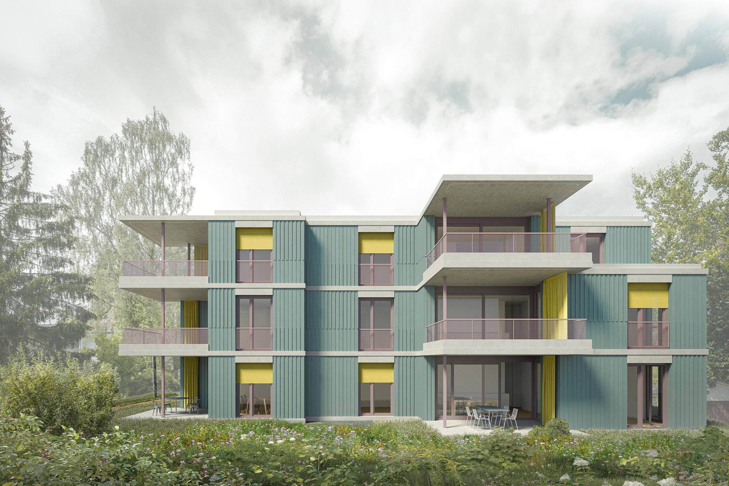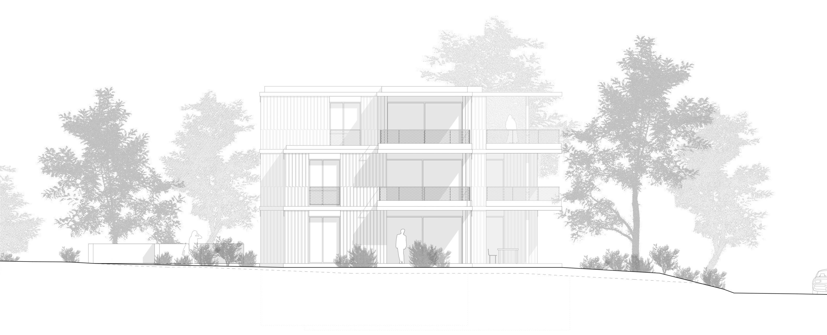 Die Erschliessung der Wohneinheiten erfolgt über einen von der Hausgemeinschaft informell nutzbaren gedeckten Aussenraum mit Treppenaufgang oder direkt über die Liftanlage, welche alle Geschosse von der Einstellhalle bis ins 2.Obergeschoss vertikal verbindet. Das Wohnungsangebot umfasst 5 Einheiten verteilt über 3 Geschosse. Durch die mittige Setzung und gestaffelte Form des Baukörpers werden im Aussenraum Zonen unterschiedlicher Privatheit, Aufenthaltsqualität und Atmosphären geschaffen.