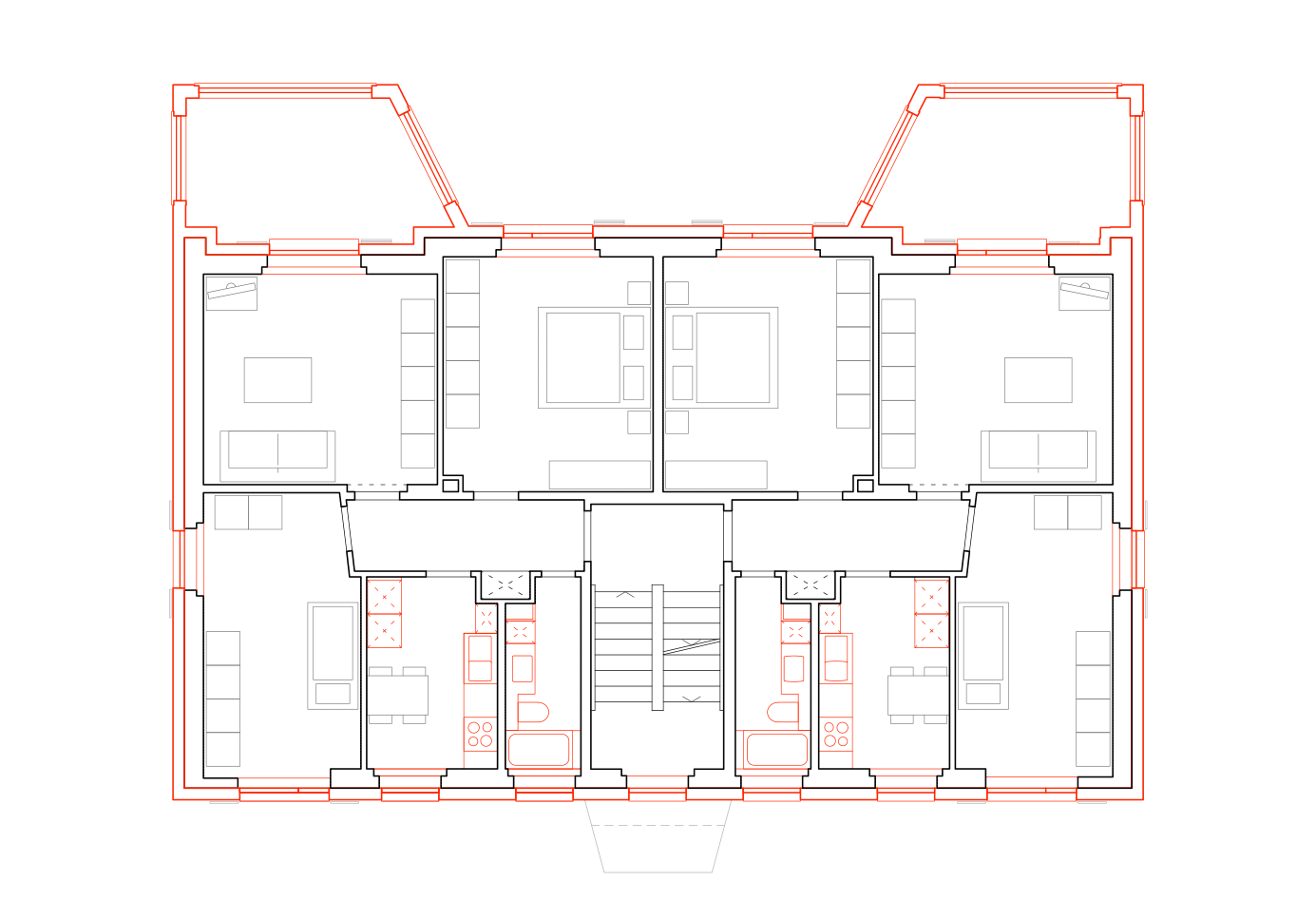Die grösste Veränderung fand an der Südfassade der Gebäude statt, wo die bestehenden, viel zu kleinen und schlecht nutzbaren Balkone abgebrochen wurden. Sie wurden durch gedeckte, übereinander liefende Loggienanbauten ersetzt, die mit dem bestehenden Baukörper verschmelzen.