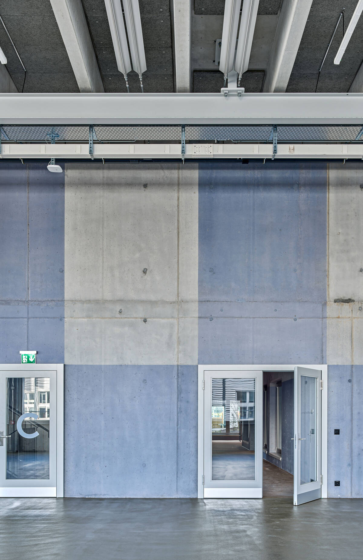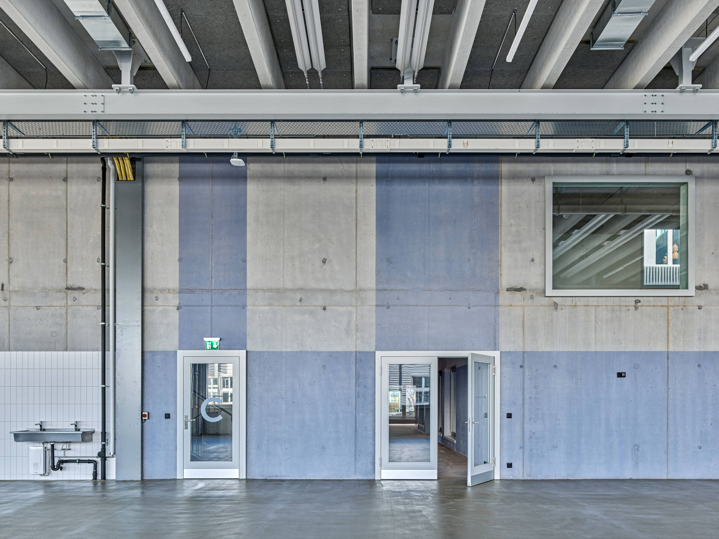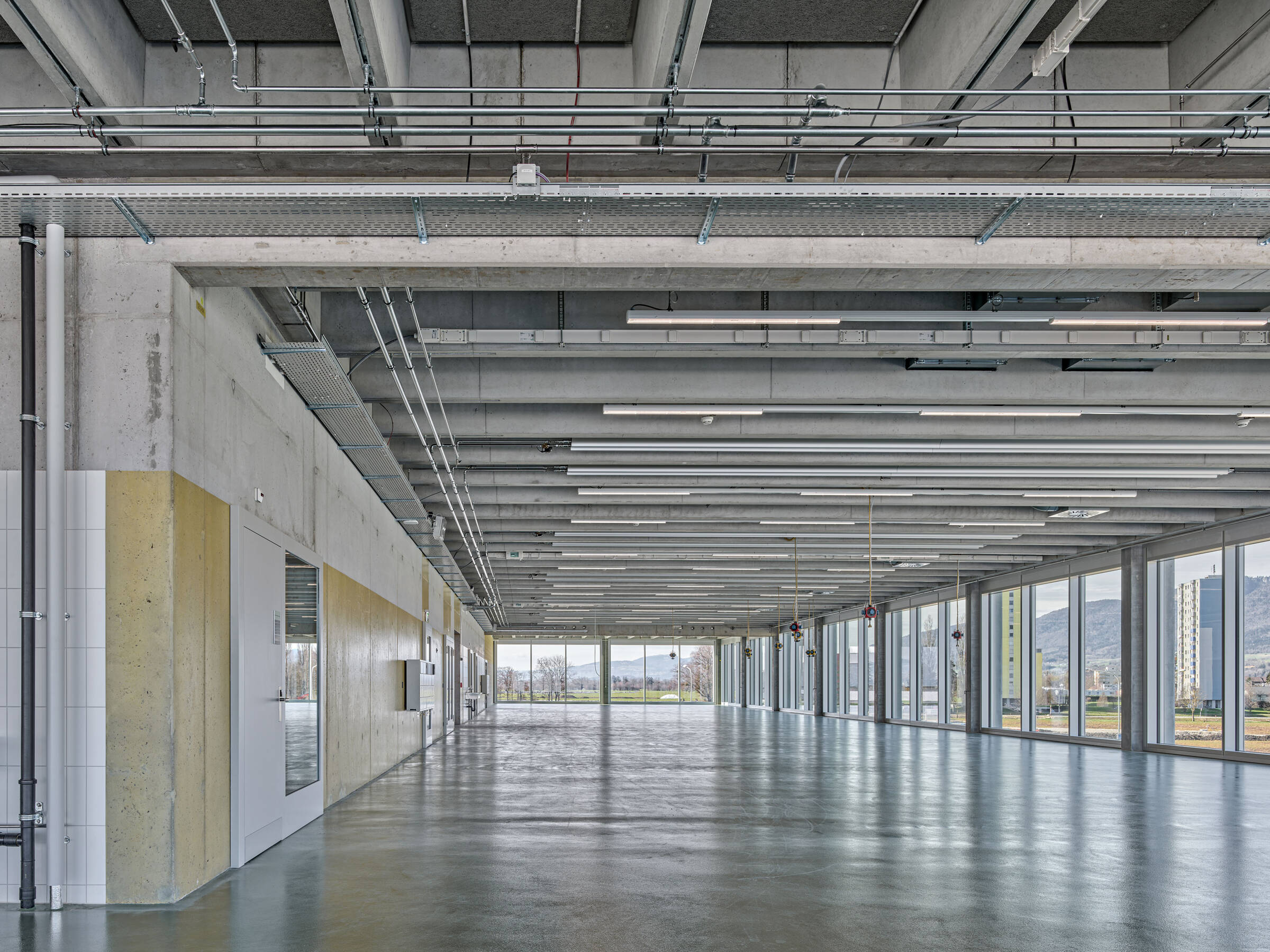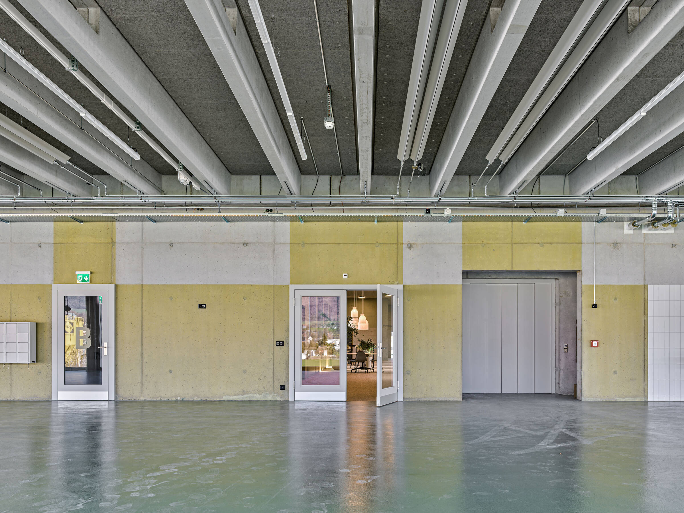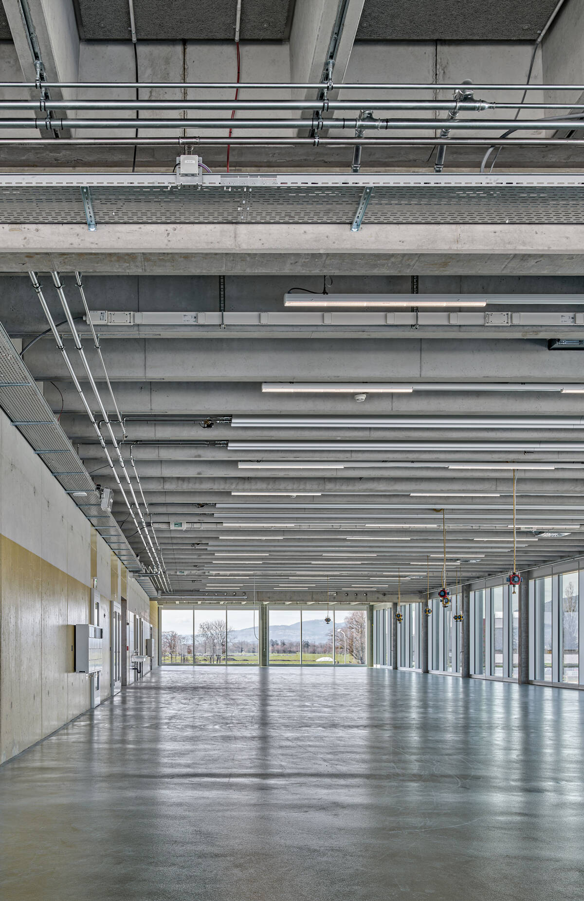 Grosse stützenfreie Werkstätte und kleinräumige Büro-und Nebenräumen mit grosszügiger Begegnungszone für alle Mitarbeitenden beinhaltete das Raumprogramm. Der Entwurf bildet mit einem einfachen Konzept bestehend aus einem äusseren Kranz mit innerem Kern diese Raumstruktur ab. Im äusseren Kranz liegen die Werkstätten und Produktionsräume. Eine Deckenkonstruktion mit vorfabrizierten Betonrippen ermöglicht eine stützenfreie Ausbildung dieser Räume zugunsten einer grösstmöglichen Flexibilität.