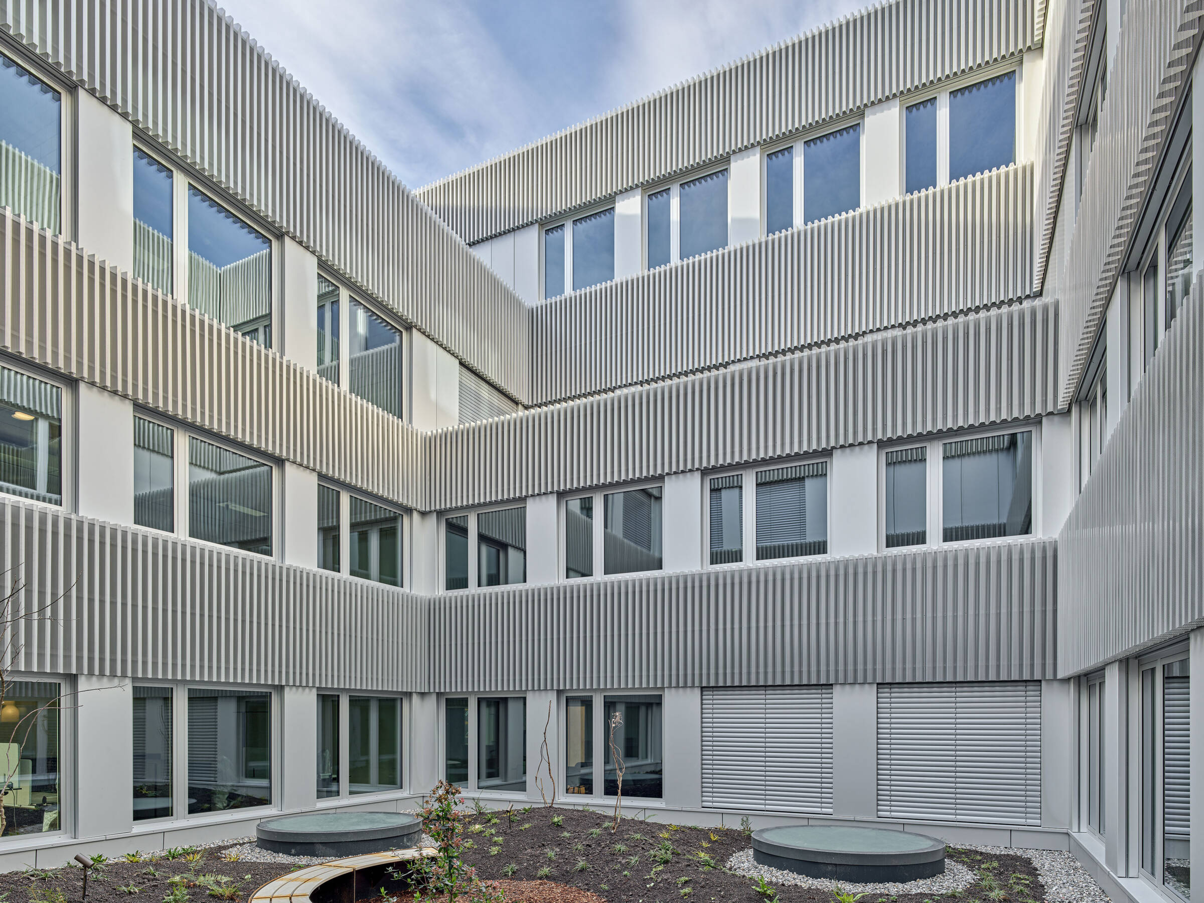 Die Innenhoffassade wird mit einer Verkleidung aus perforierten, vorgehängten Trapezblechen im Bereich der Brüstungen gegliedert. Die Bleche erscheinen durch die Lochperforation transparent und leicht und nehmen mit ihrer Eloxalfarbe die Farben der sich saisonal verändernden Begrünung im Innenhof auf.