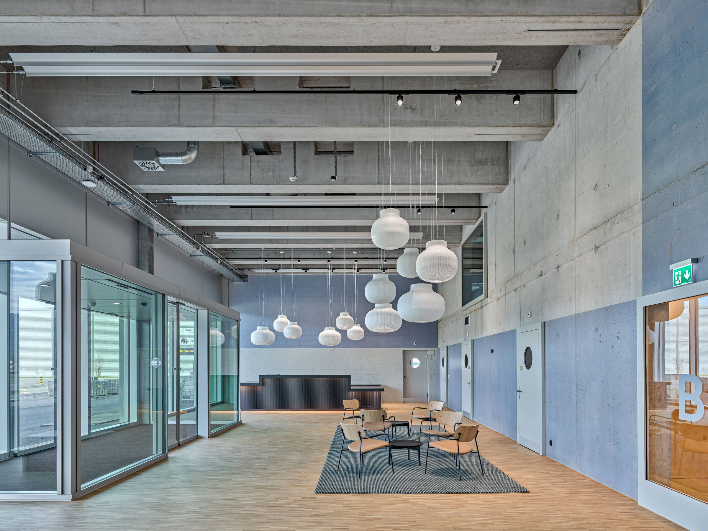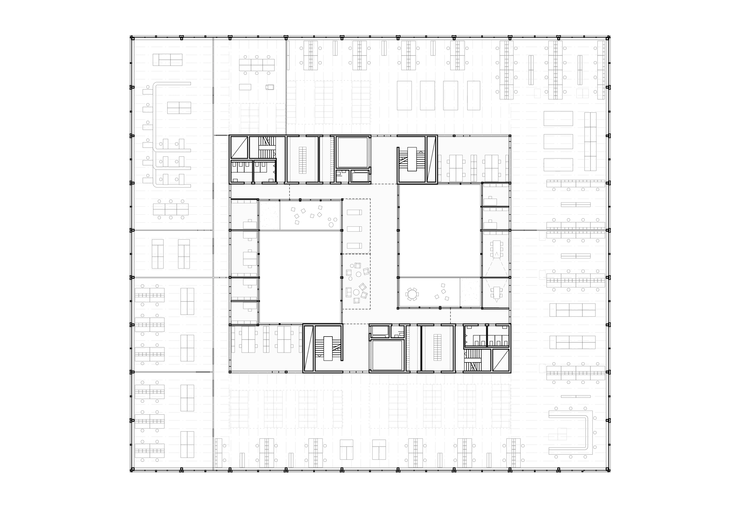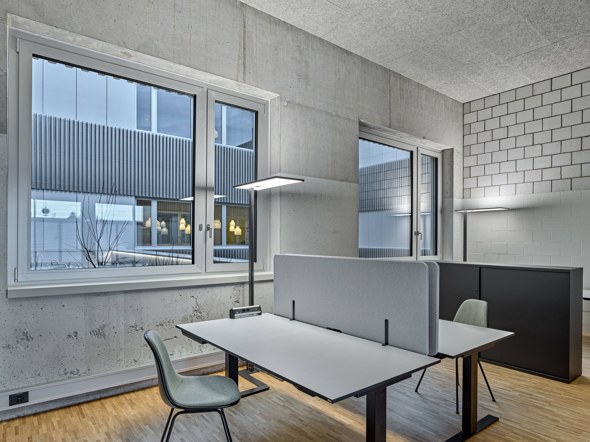 Der Konstruktionsraster legt sich als übergeordnetes Organisationsprinzip über das ganze Gebäude. Im inneren Kern sind Büros, sowie sämtliche Neben- und Erschliessungsräume um zwei begrünte Innenhöfe angeordnet, welche die Räumlichkeiten mit natürlichem Licht versorgen und mit ihrer Begrünung für angenehme Stimmung sorgen. Im überhohen Erdgeschoss sind nebst dem der Haupteingang, die Anlieferung und die Produktionsräume mit lärmintensiven Arbeiten und erhöhtem Raumbedarf untergebracht.