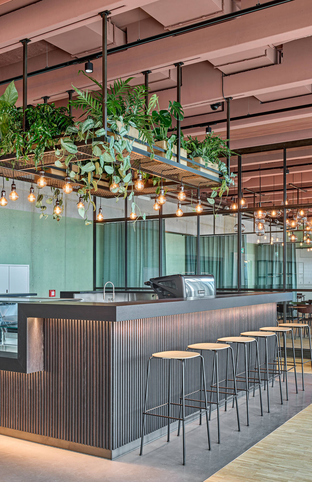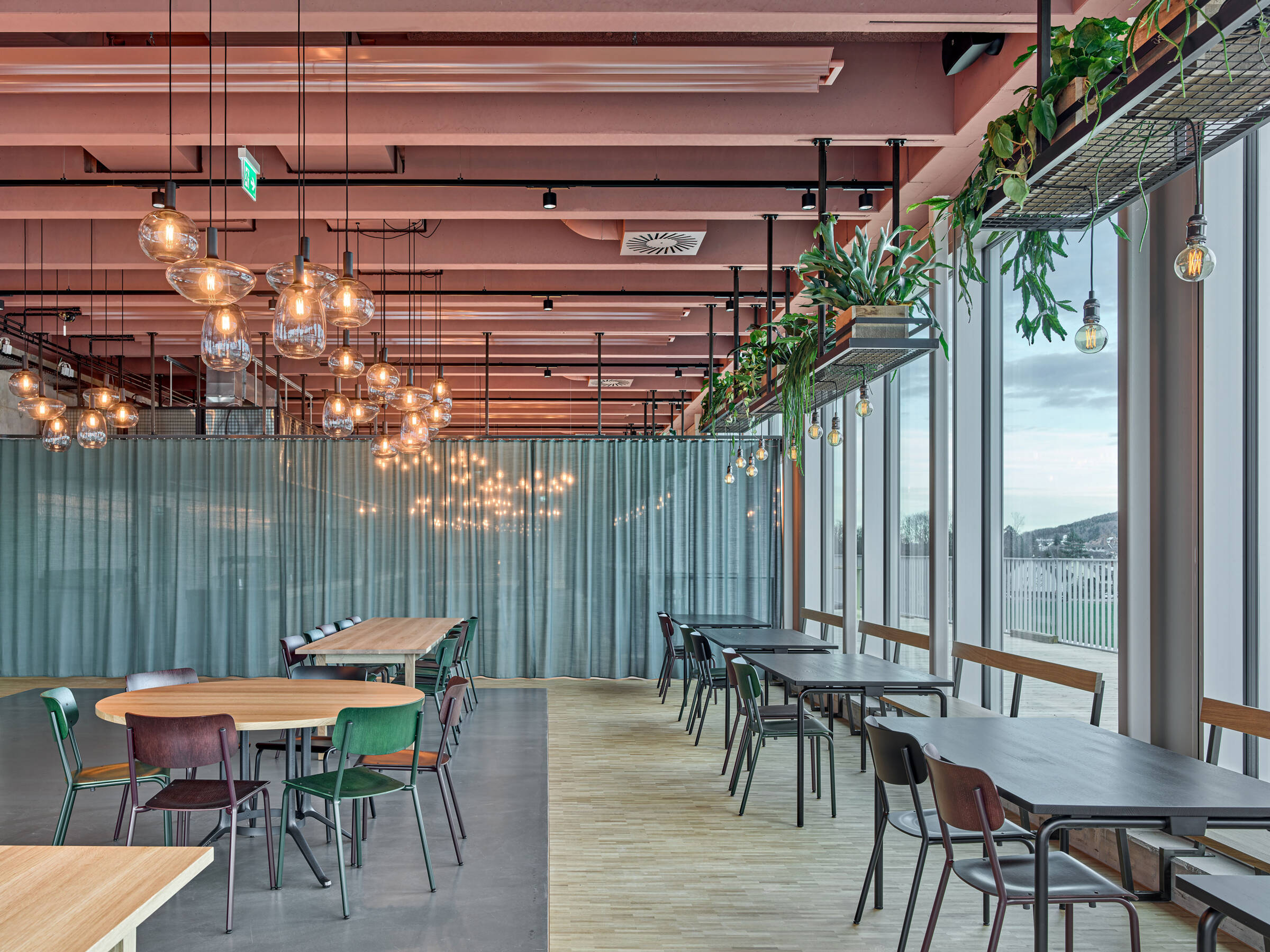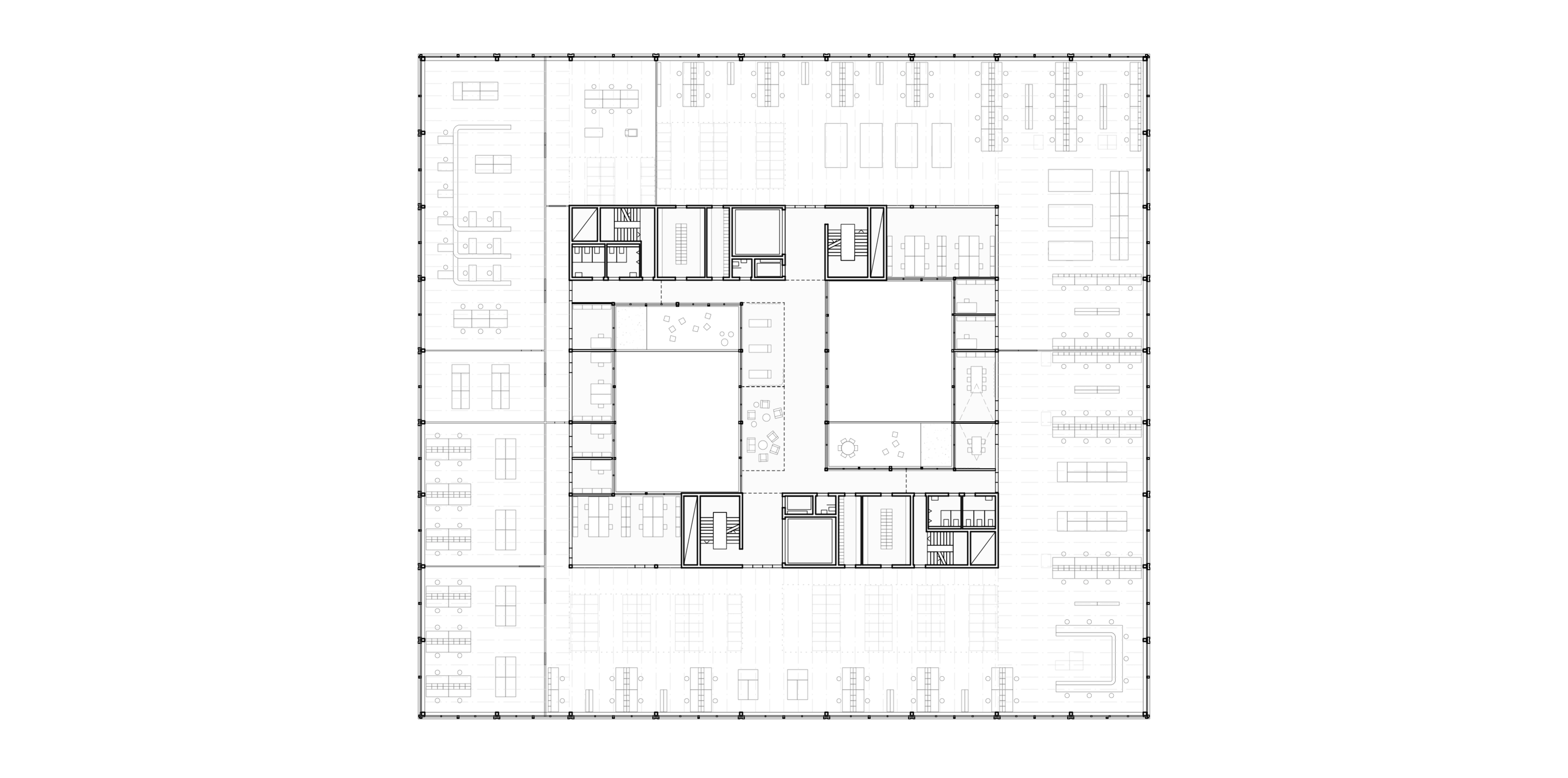 Der Konstruktionsraster legt sich als übergeordnetes Organisationsprinzip über das ganze Gebäude. Im inneren Kern sind Büros, sowie sämtliche Neben- und Erschliessungsräume um zwei begrünte Innenhöfe angeordnet, welche die Räumlichkeiten mit natürlichem Licht versorgen und mit ihrer Begrünung für angenehme Stimmung sorgen. Im überhohen Erdgeschoss sind nebst dem der Haupteingang, die Anlieferung und die Produktionsräume mit lärmintensiven Arbeiten und erhöhtem Raumbedarf untergebracht.