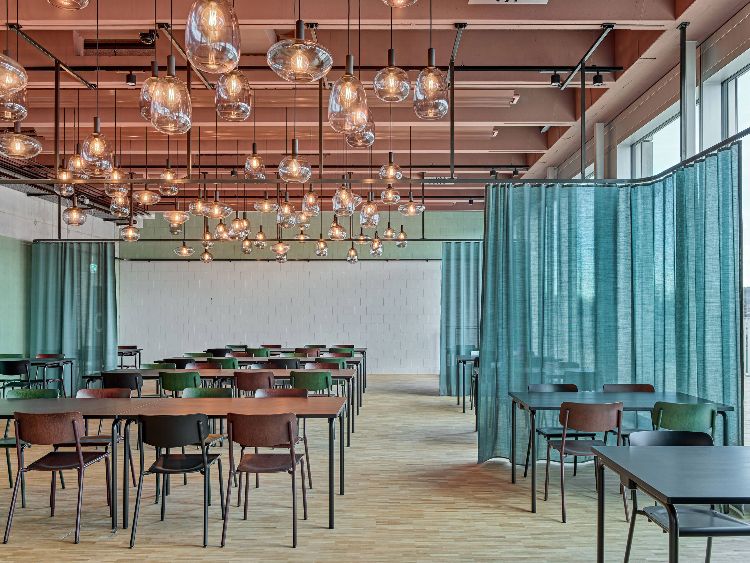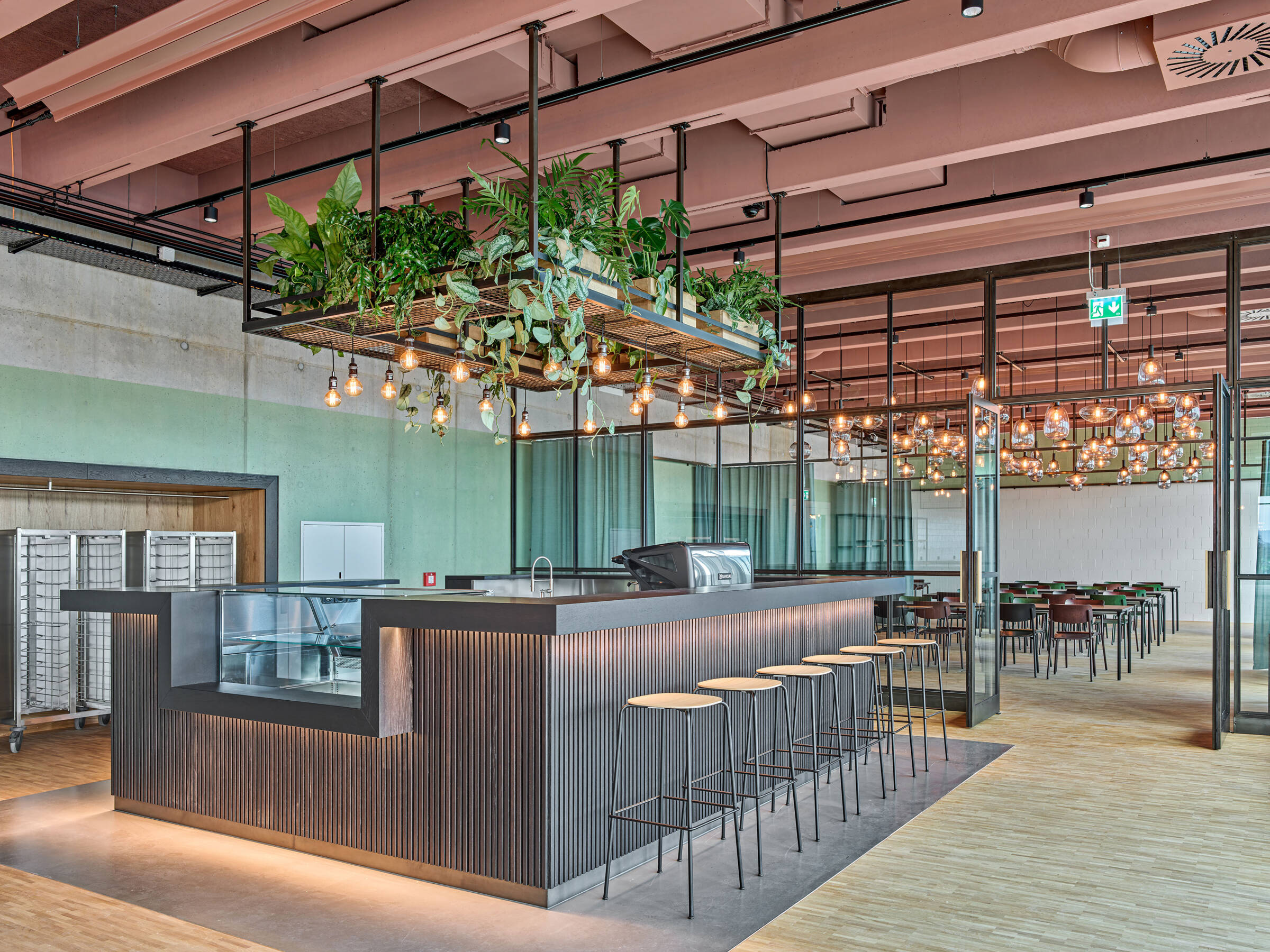 Das Zwischengeschoss beinhaltet ausschliesslich Büroräume. In den Obergeschossen sind Werkstätten für handwerkliche Arbeiten an Werktischen organisiert. Im Attikageschoss befindet sich die Genusswerkstatt, das hausinterne Restaurant. Ein grosszügiger innerer Erschliessungsbereich weitet sich zwischen den Höfen in jedem Geschoss in einen wohnliche Aufenthalts- und Begegnungsort für die Mitarbeitenden auf.