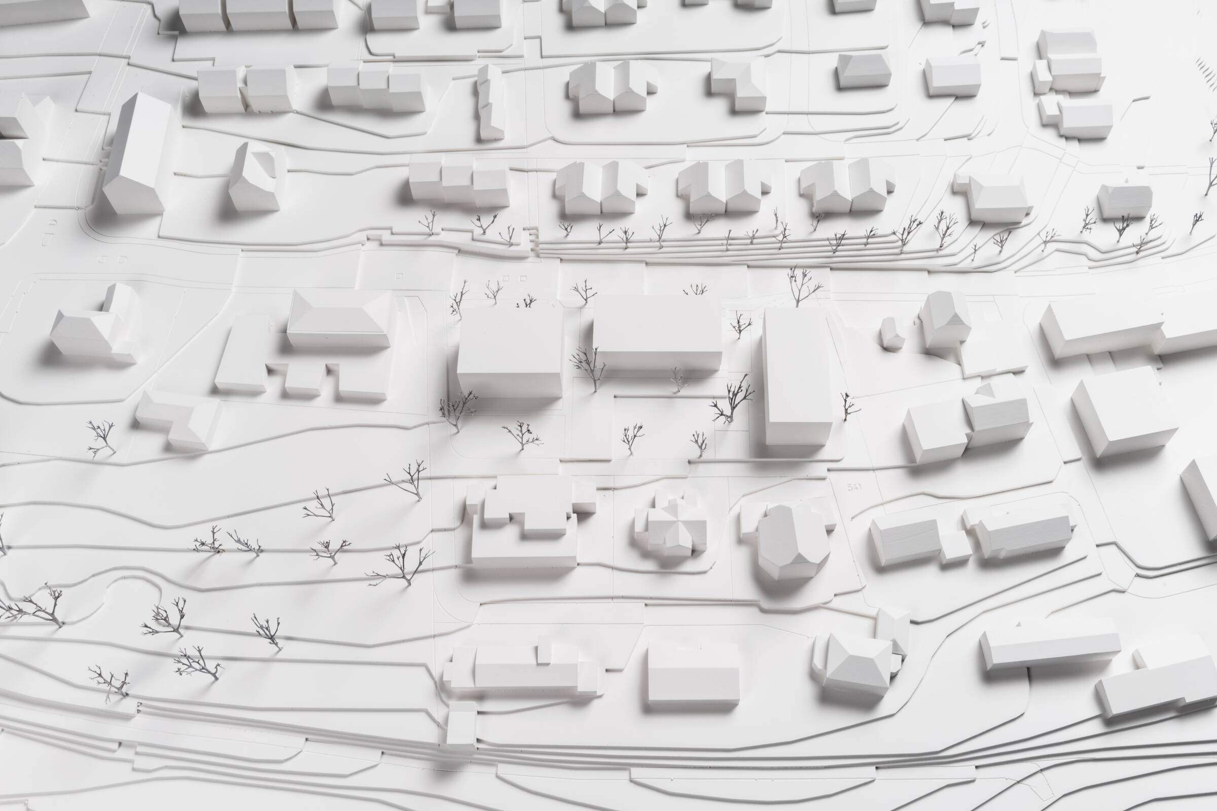 Die drei Wohnhäuser sind in ihren Dimensionen unterschiedlich ausgebildet und durch den Wechsel der Geschossigkeit in Kombination mit dem abfallenden Terrain wird eine wohl proportionierte Höhenentwicklung erreicht, welche sich selbstverständlich ins Ortsbild einfügt. Das erste Volumen sucht in seiner Geschosskeit und Positionierung den Dialog mit dem Gemeindehaus.