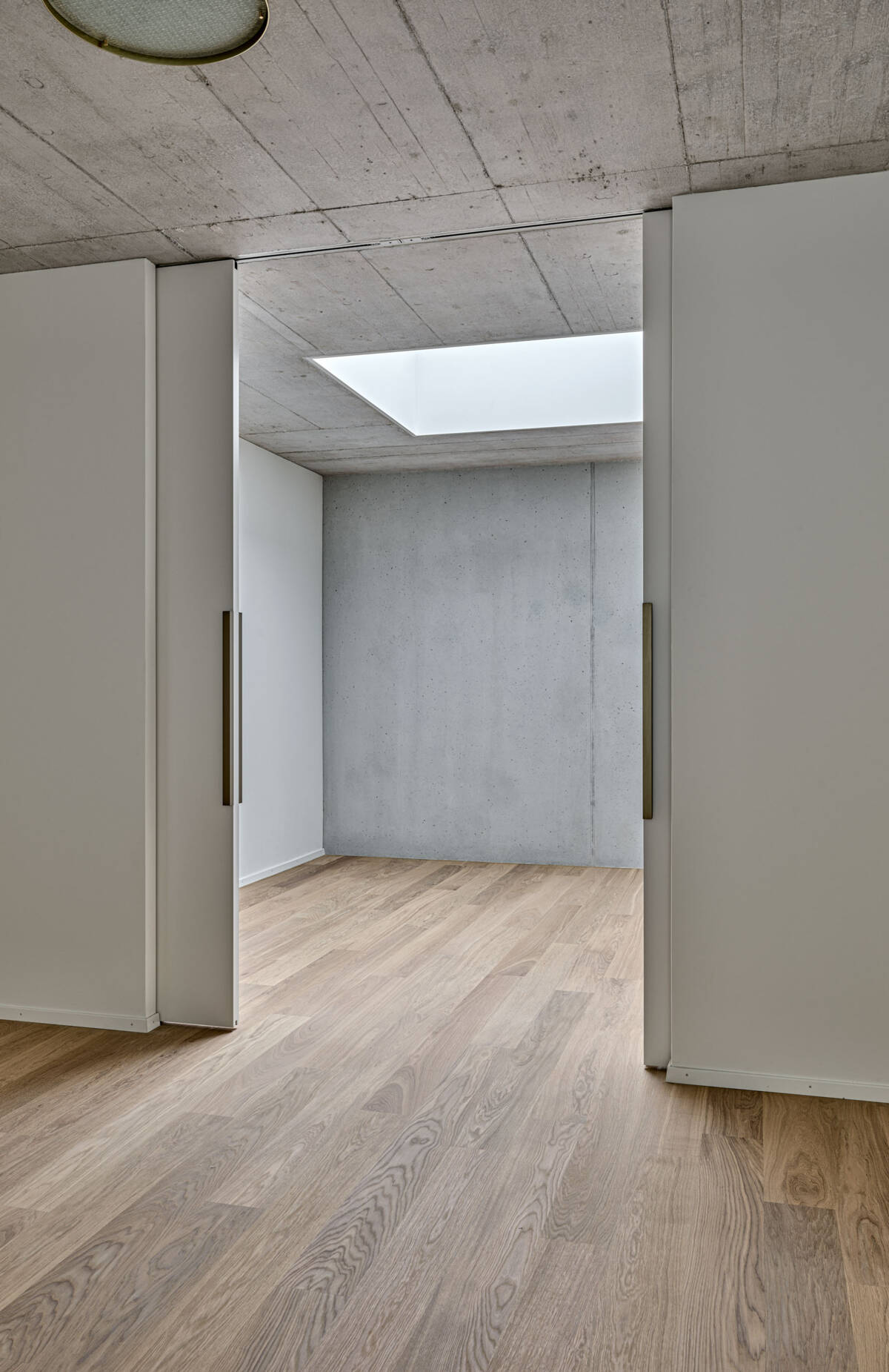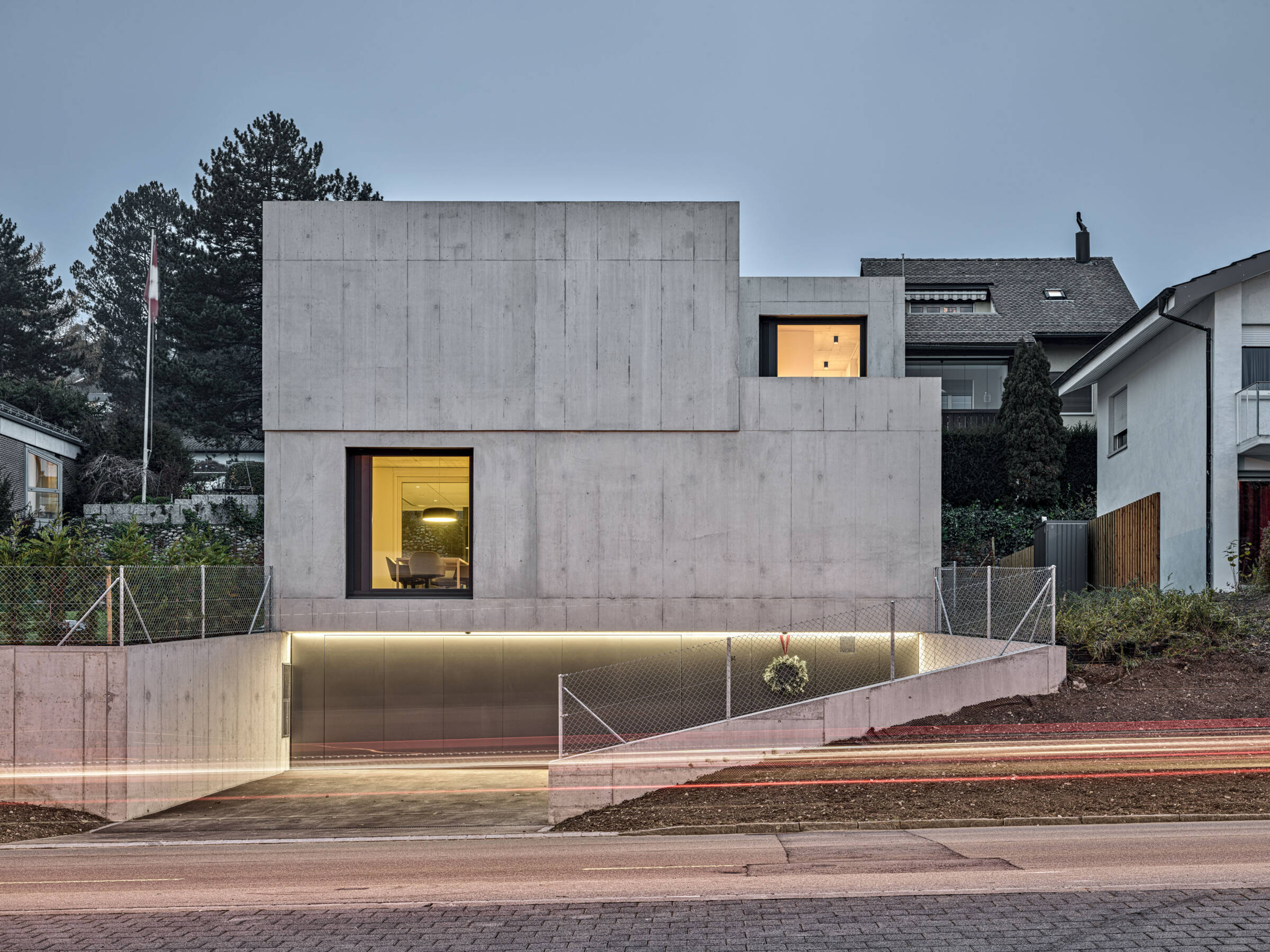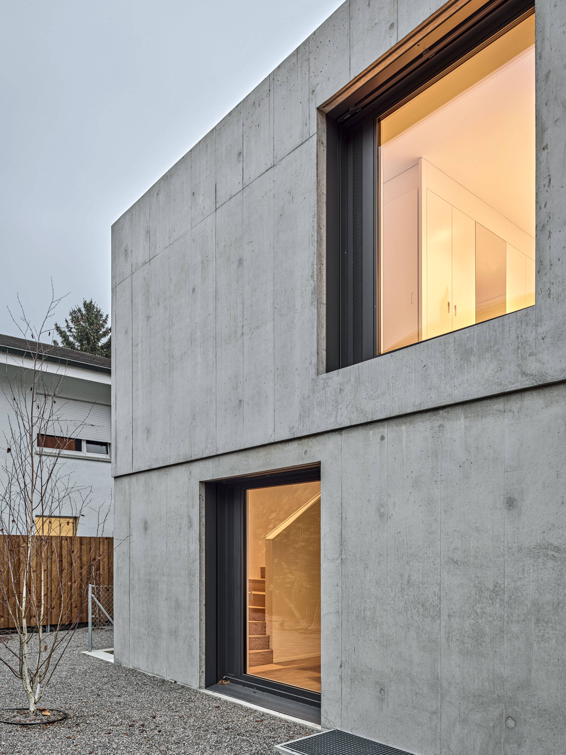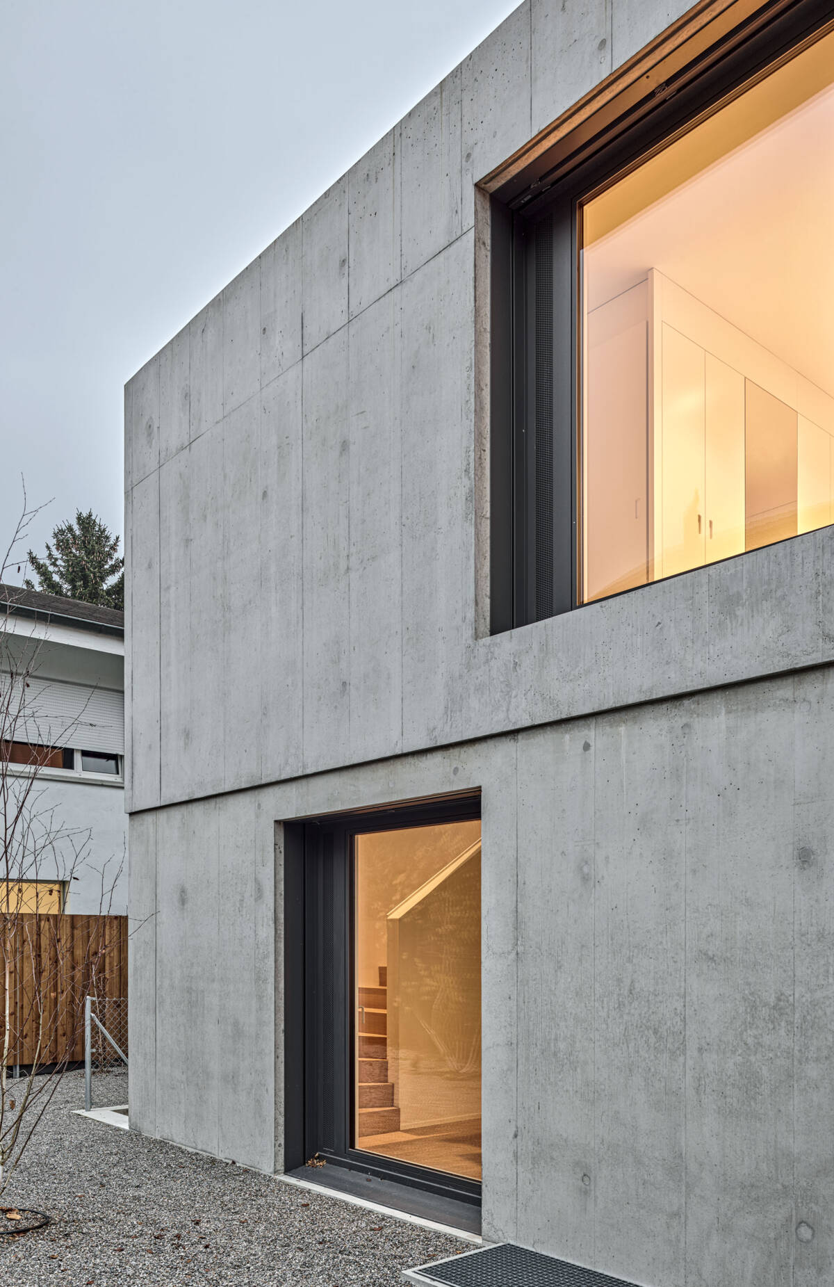 Die Kubatur zeigt sich nach aussen schlicht und unaufgeregt und differenziert sich dennoch deutlich von den umliegenden Einfamilienhäusern. Eine zweischalige Fassade mit Kerndämmung ermöglicht die homogene Betonoptik an allen Aussenwänden. Dieser Ausdruck wird in den Elementen zur Hangsicherung fortgeführt und somit Gebäude und Terrain miteinander verzahnt. Präzise gesetzte Fensteröffnungen und Oberlichter bieten gezielte Ausblicke und spezifische Raum- und Lichtstimmungen. Ein durchgehender Bodenbelag aus Holzparkett, der mit unverputzten Betondeckenuntersichten kontrastiert, und sorgfältig angeordnete, teils raumhohe Innentüren lassen ein offenes Raumgefüge entstehen.