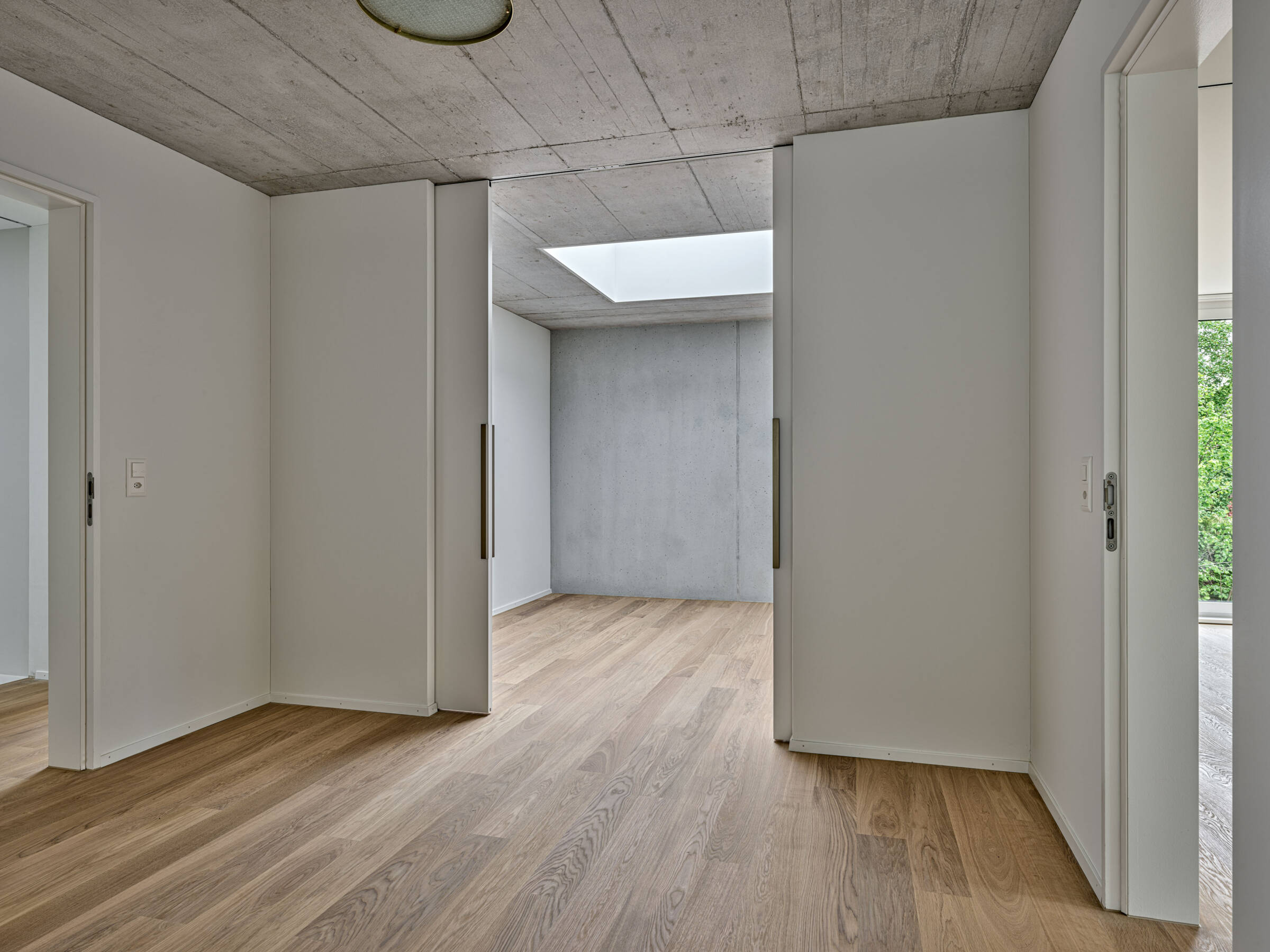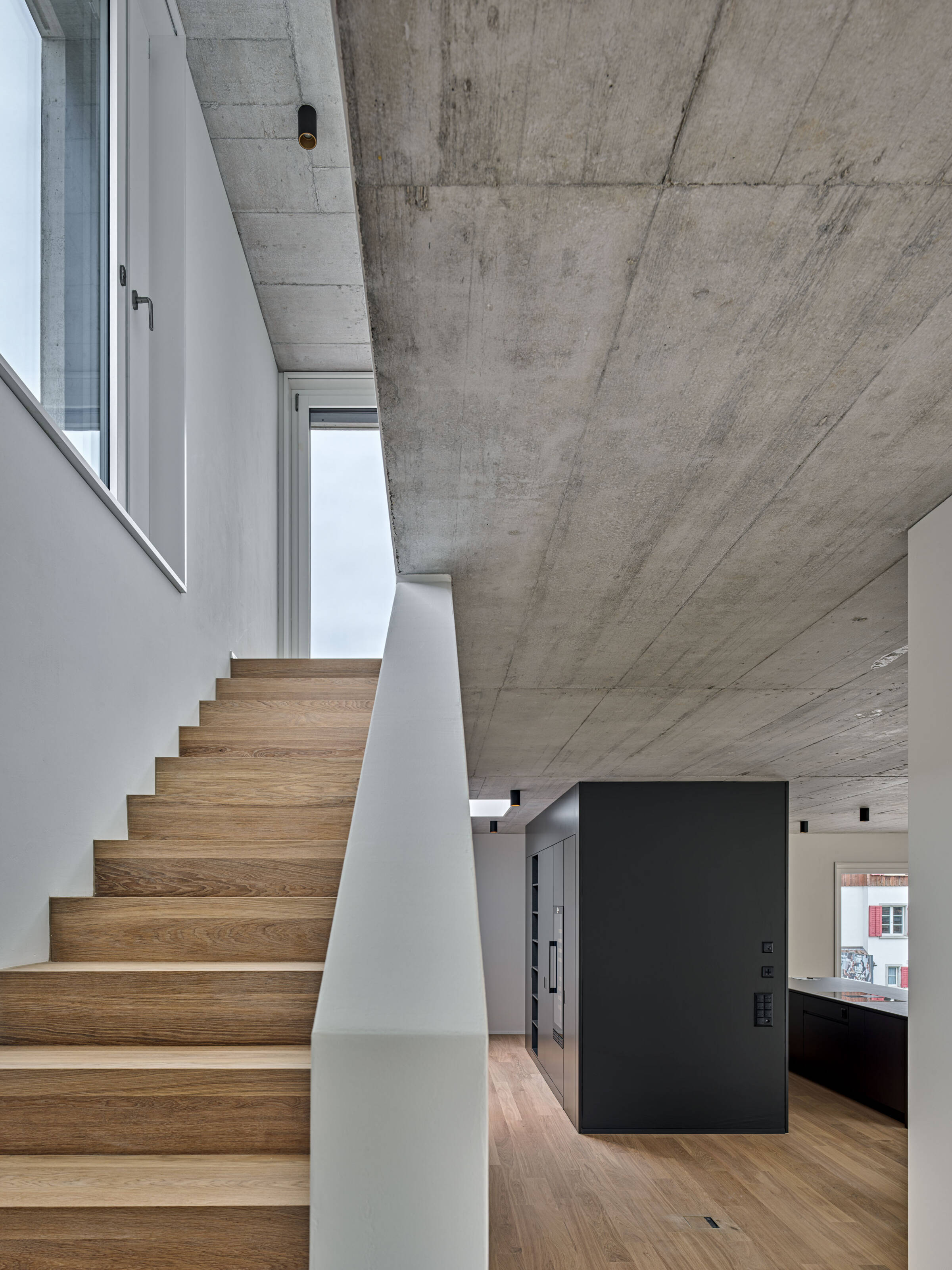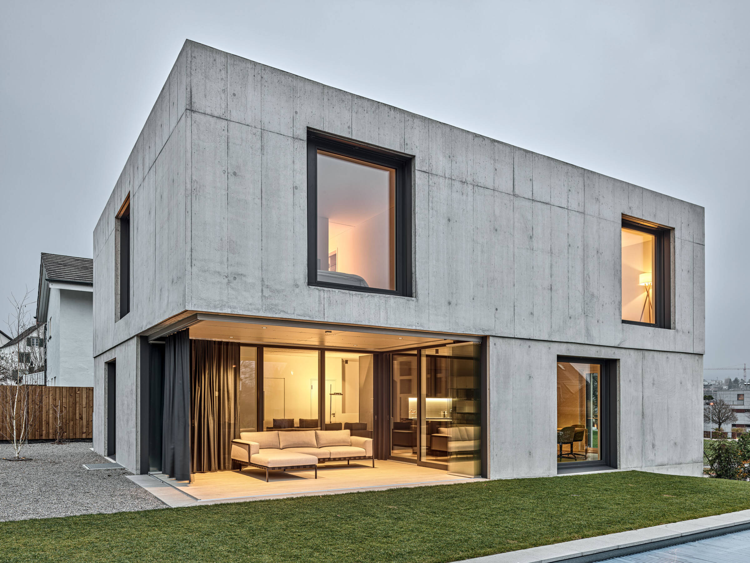 Die Kubatur zeigt sich nach aussen schlicht und unaufgeregt und differenziert sich dennoch deutlich von den umliegenden Einfamilienhäusern. Eine zweischalige Fassade mit Kerndämmung ermöglicht die homogene Betonoptik an allen Aussenwänden. Dieser Ausdruck wird in den Elementen zur Hangsicherung fortgeführt und somit Gebäude und Terrain miteinander verzahnt. Präzise gesetzte Fensteröffnungen und Oberlichter bieten gezielte Ausblicke und spezifische Raum- und Lichtstimmungen. Ein durchgehender Bodenbelag aus Holzparkett, der mit unverputzten Betondeckenuntersichten kontrastiert, und sorgfältig angeordnete, teils raumhohe Innentüren lassen ein offenes Raumgefüge entstehen.