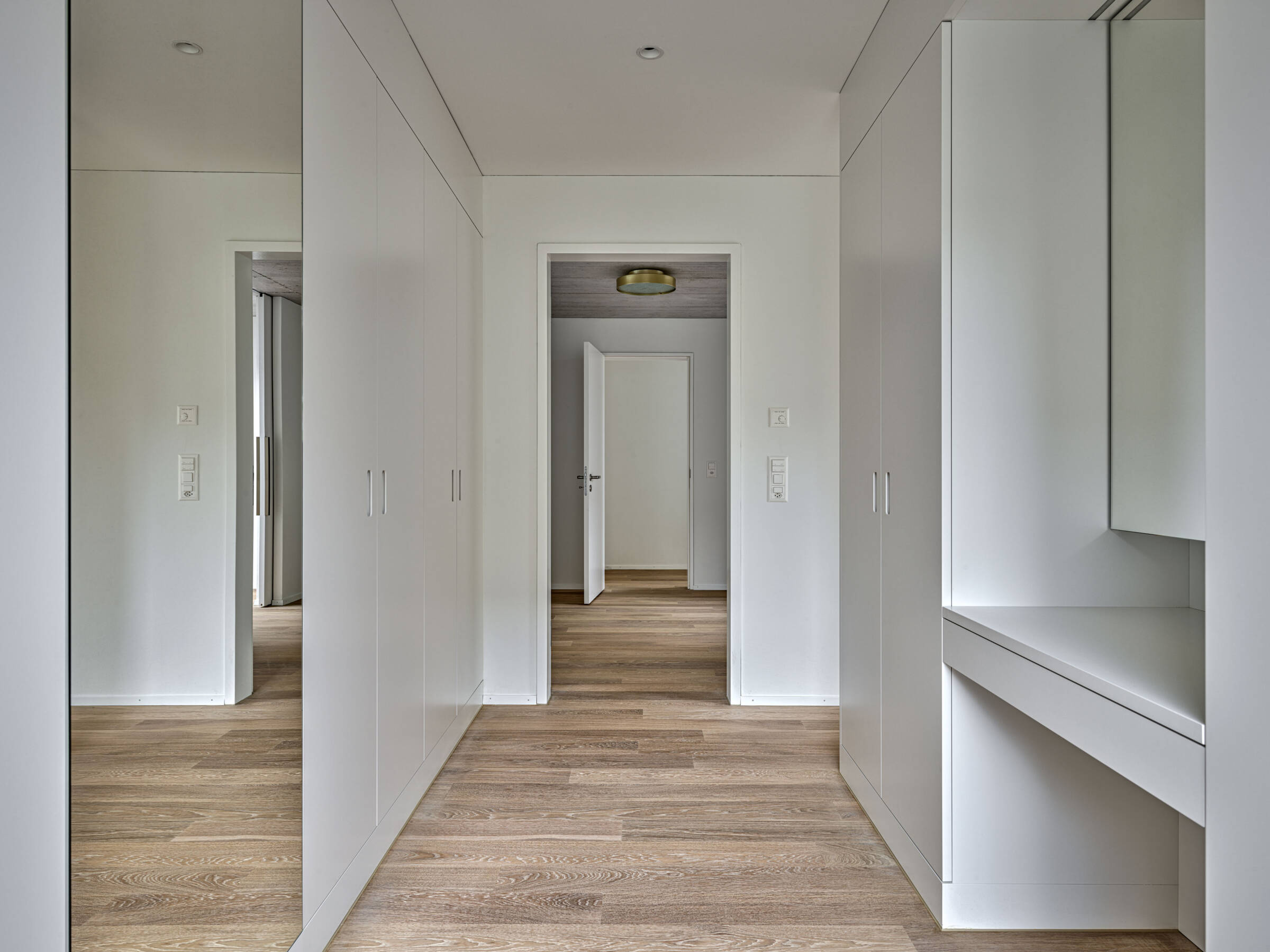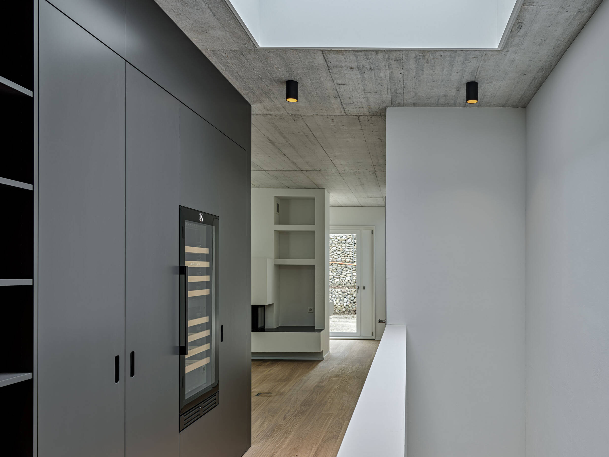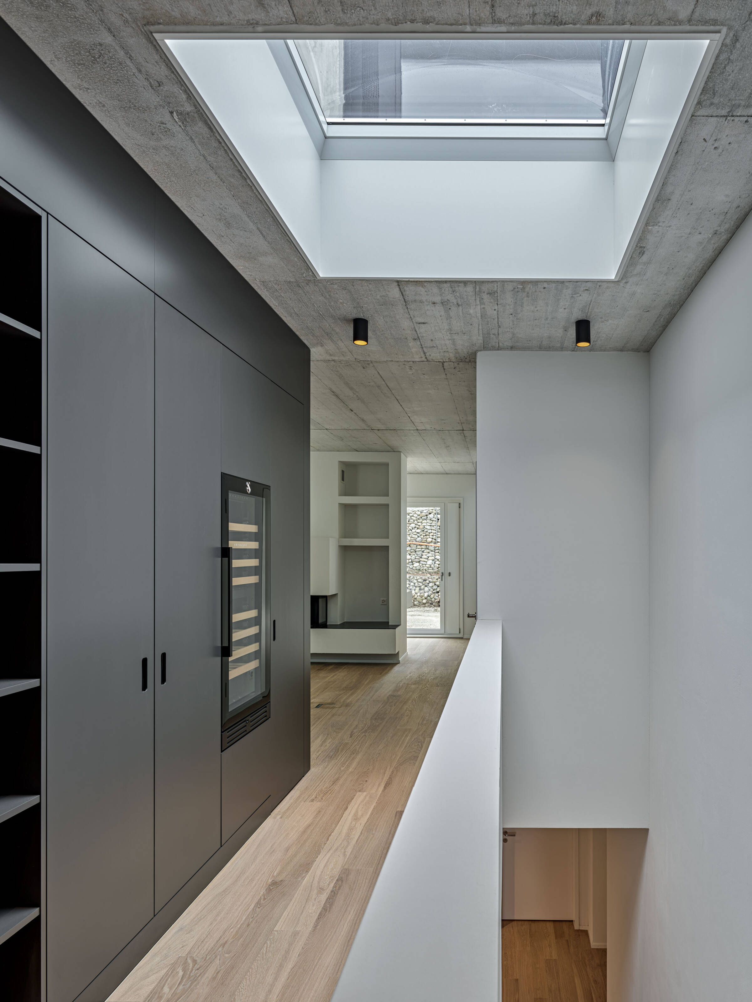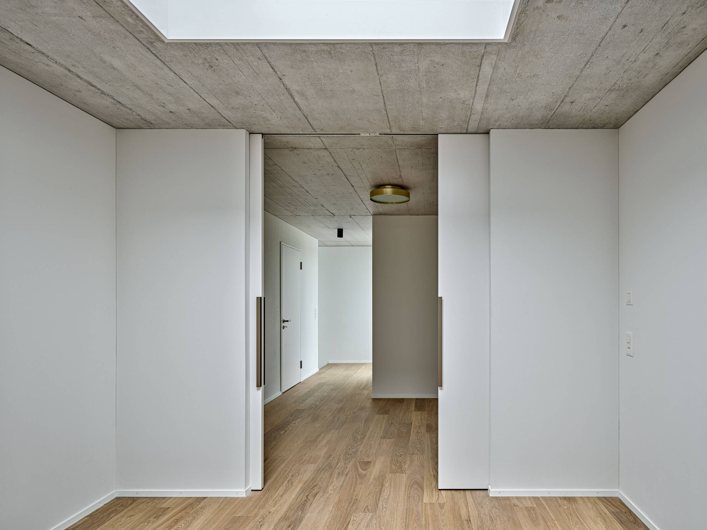 Die Kubatur zeigt sich nach aussen schlicht und unaufgeregt und differenziert sich dennoch deutlich von den umliegenden Einfamilienhäusern. Eine zweischalige Fassade mit Kerndämmung ermöglicht die homogene Betonoptik an allen Aussenwänden. Dieser Ausdruck wird in den Elementen zur Hangsicherung fortgeführt und somit Gebäude und Terrain miteinander verzahnt. Präzise gesetzte Fensteröffnungen und Oberlichter bieten gezielte Ausblicke und spezifische Raum- und Lichtstimmungen. Ein durchgehender Bodenbelag aus Holzparkett, der mit unverputzten Betondeckenuntersichten kontrastiert, und sorgfältig angeordnete, teils raumhohe Innentüren lassen ein offenes Raumgefüge entstehen.