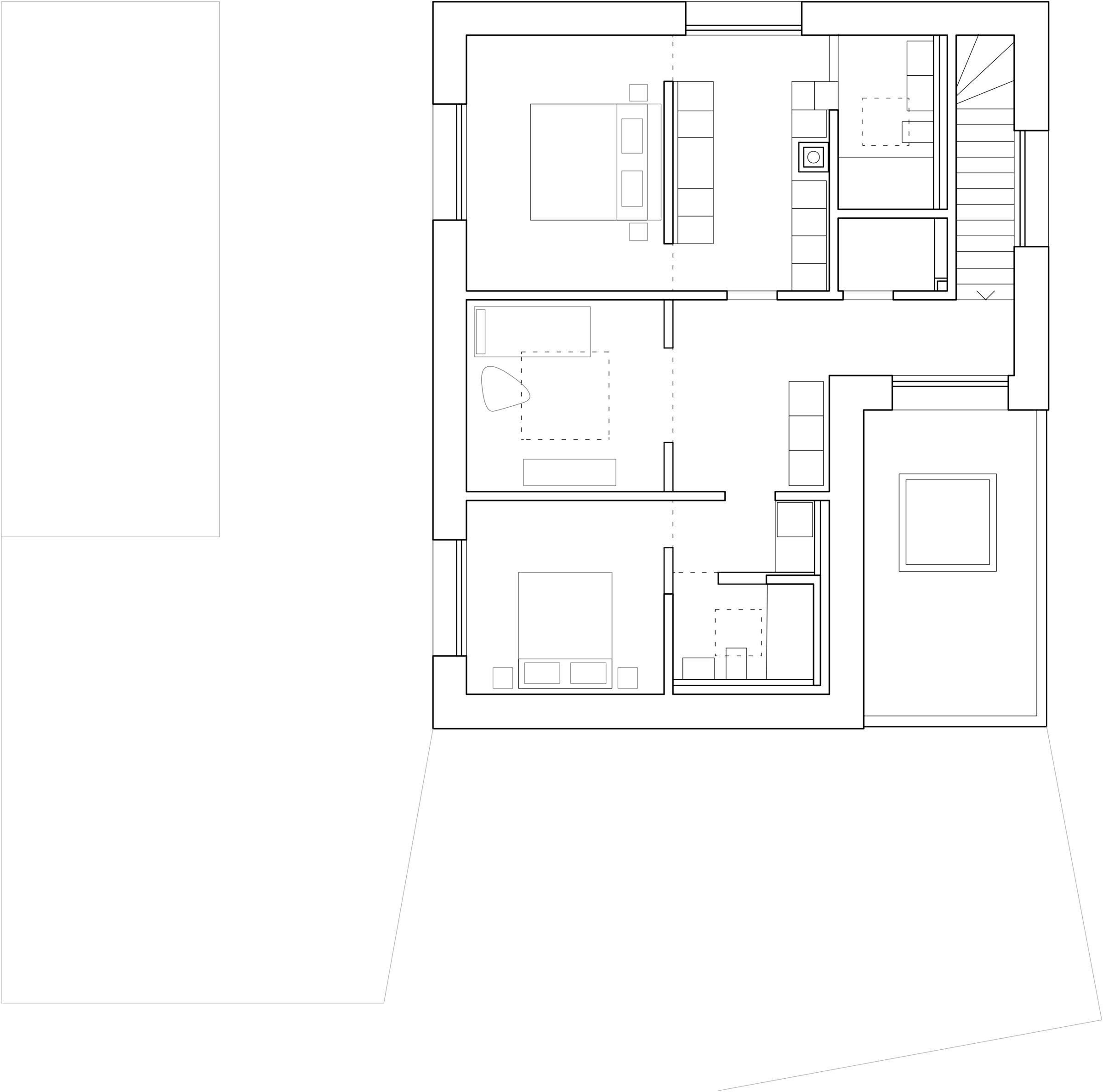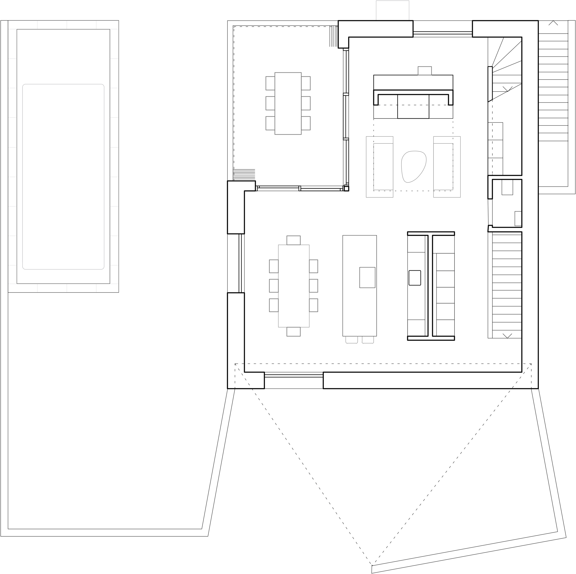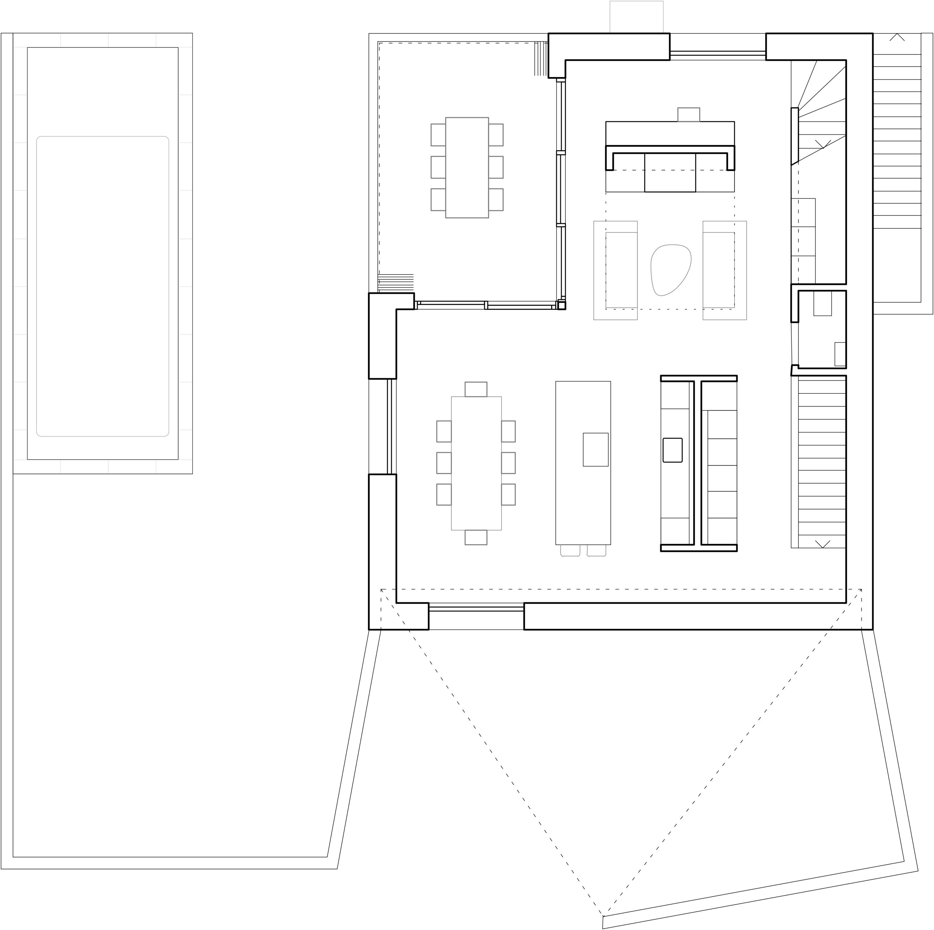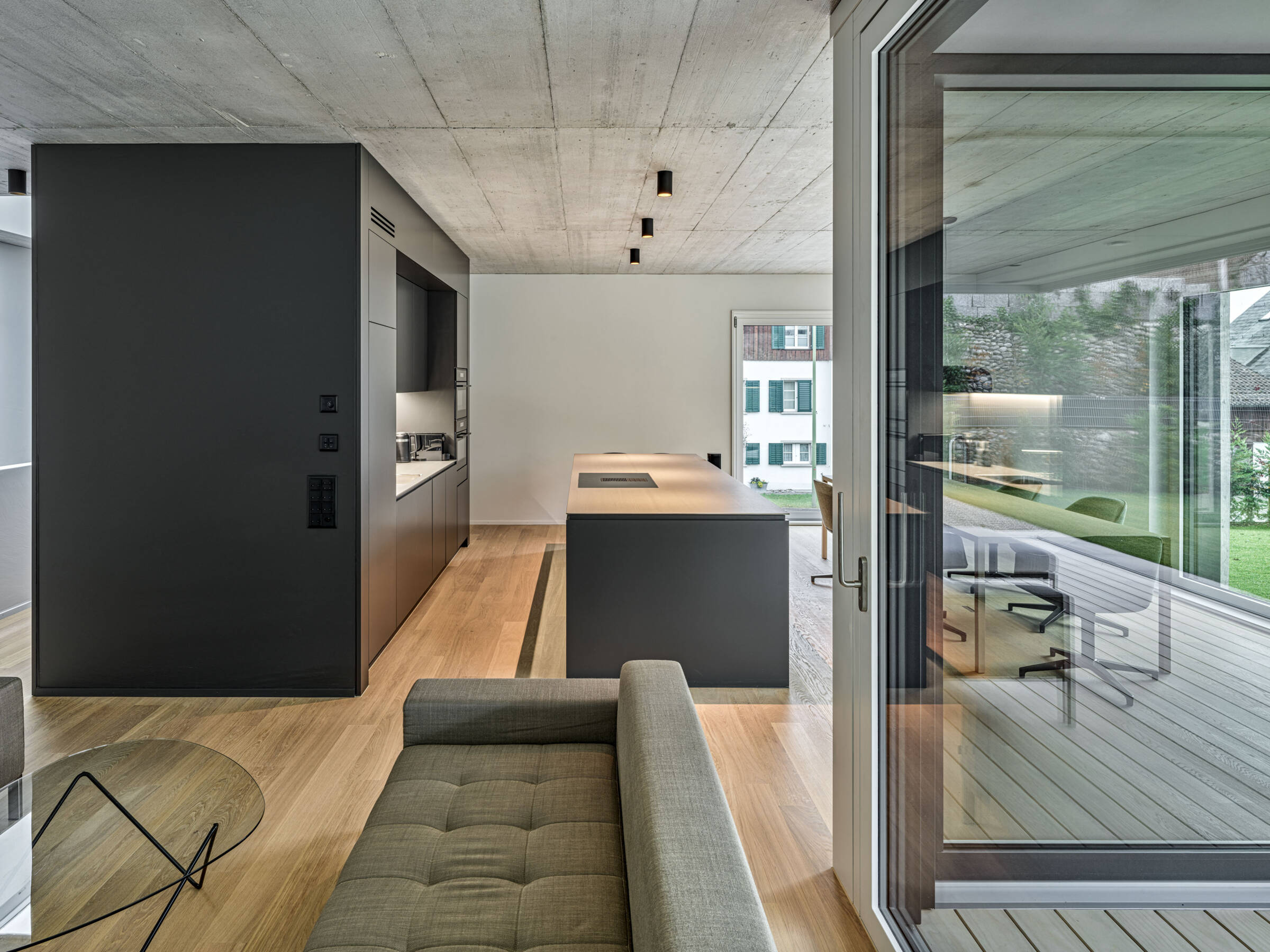Der von aussen verschlossene Eindruck löst sich im Inneren in fließenden, lichtdurchfluteten Räumen auf. Die offene Wohnebene wird durch freistehende Raumelemente zoniert. Die Küche mit freistehender Kochinsel ist offen dem Essraum zugeschaltet. Der Wohnraum wird von einer raumhohen Trennwand mit integriertem Cheminée gefasst und öffnet sich über eine Fensterfront zur geschützten Eckloggia, die nahtlos in den ebenerdigen Garten führt. Dieses «Gartenzimmer» dient dem Wohnen zwischen Innen- und Aussenraum und lässt sich als Wintergarten oder Aussenterrasse mit gedecktem Sitzplatz vielseitig nutzen. Eine offene Treppe führt in das Obergeschoss, das die Individualräume beherbergt.