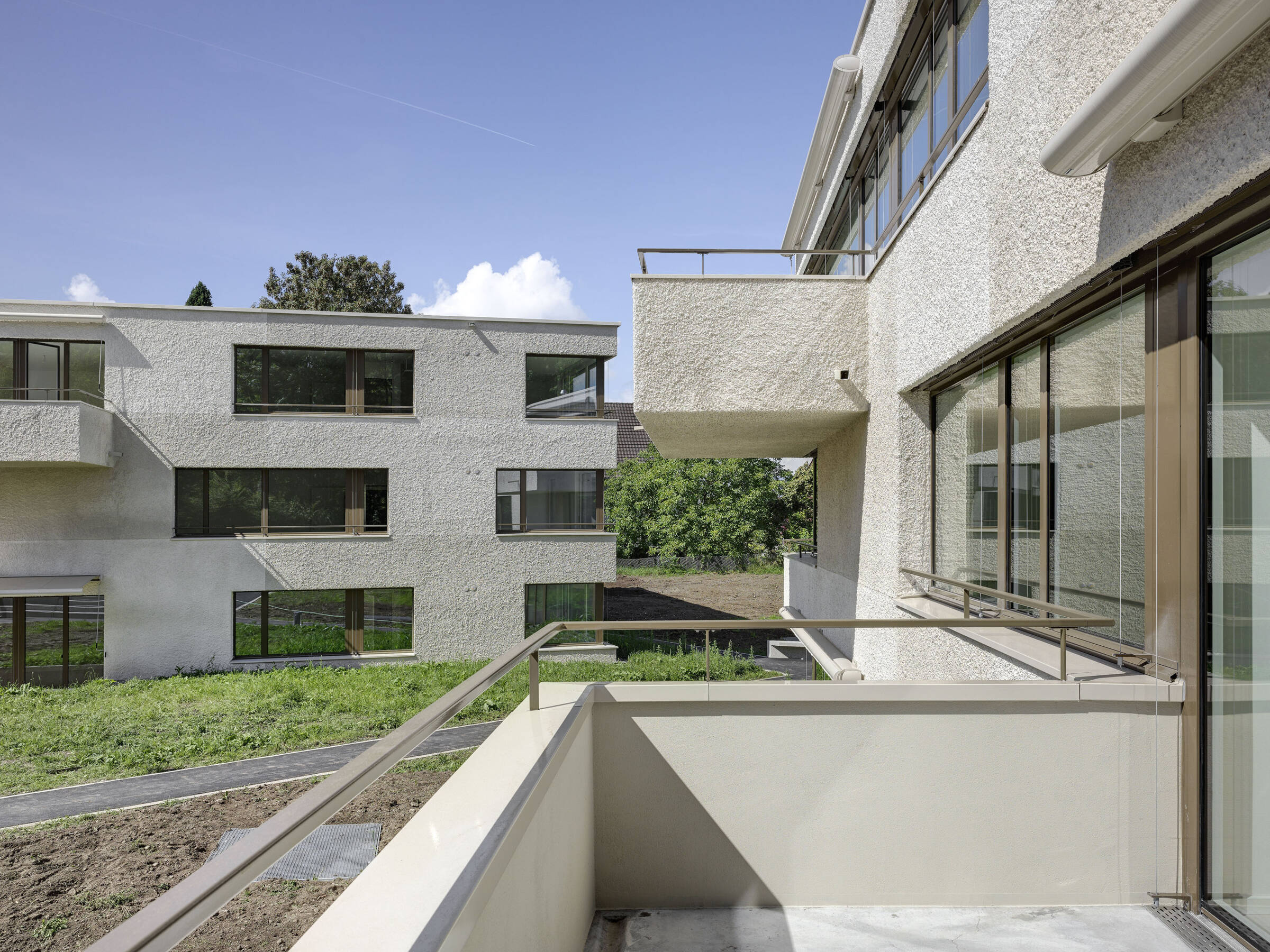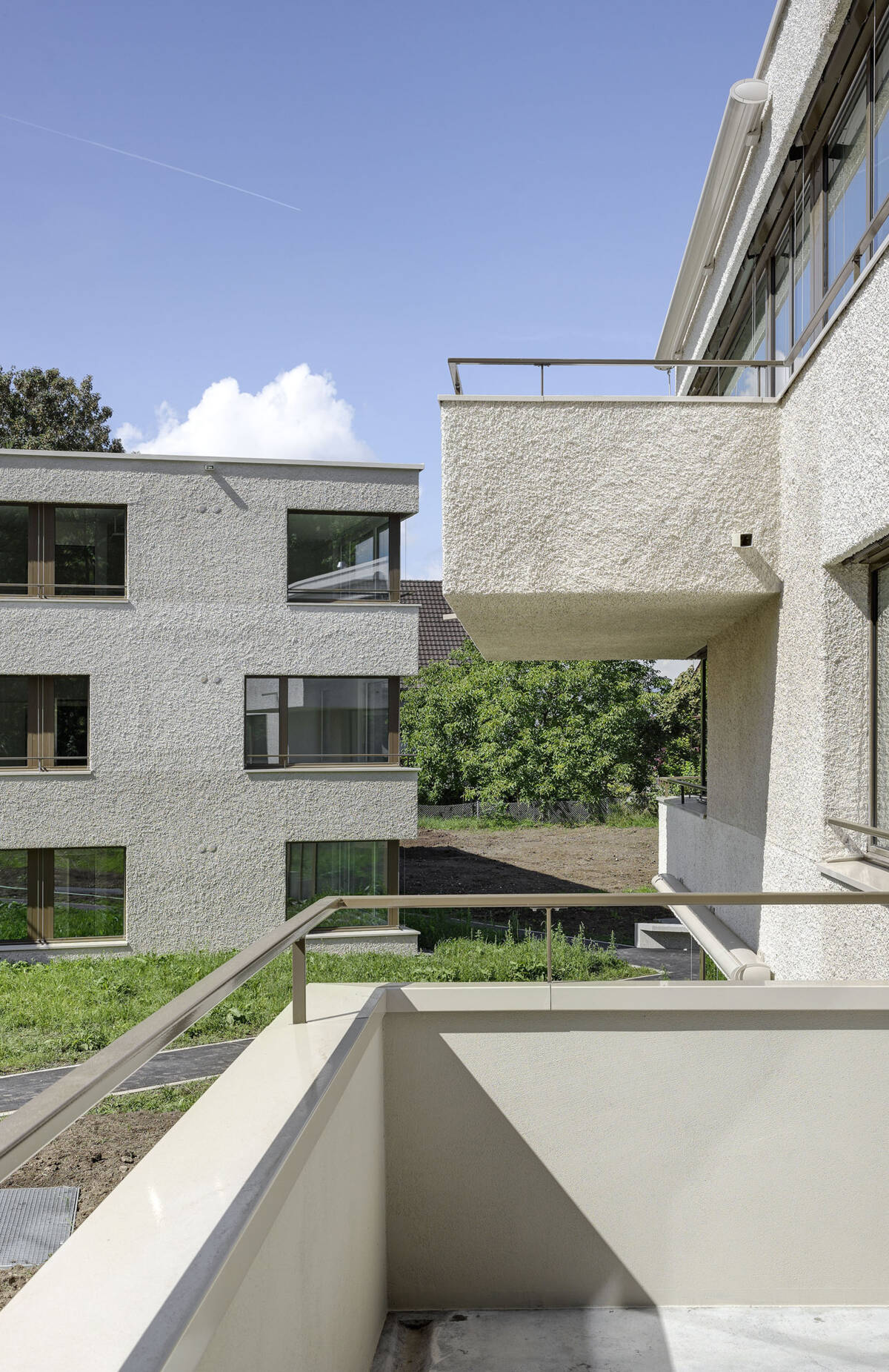 Die geschossweise alternierend versetzten Aussenräume wirken raumerweiternd und sind als Weiterführung der Fensterbrüstungen skulptural in die Fassade eingebunden. Deren Typologie basiert auf einer Lochfassade, die sich fliessend Richtung Süden öffnet und dabei ein charakteristisches murales Raumgitter erzeugt. Der einheitliche architektonische Ausdruck und die Materialisierung vermittelt Eigenständigkeit und Präsenz – und verdeutlicht die Angemessenheit, die der kostengünstigen Realisierbarkeit der Siedlung zugrunde lag.