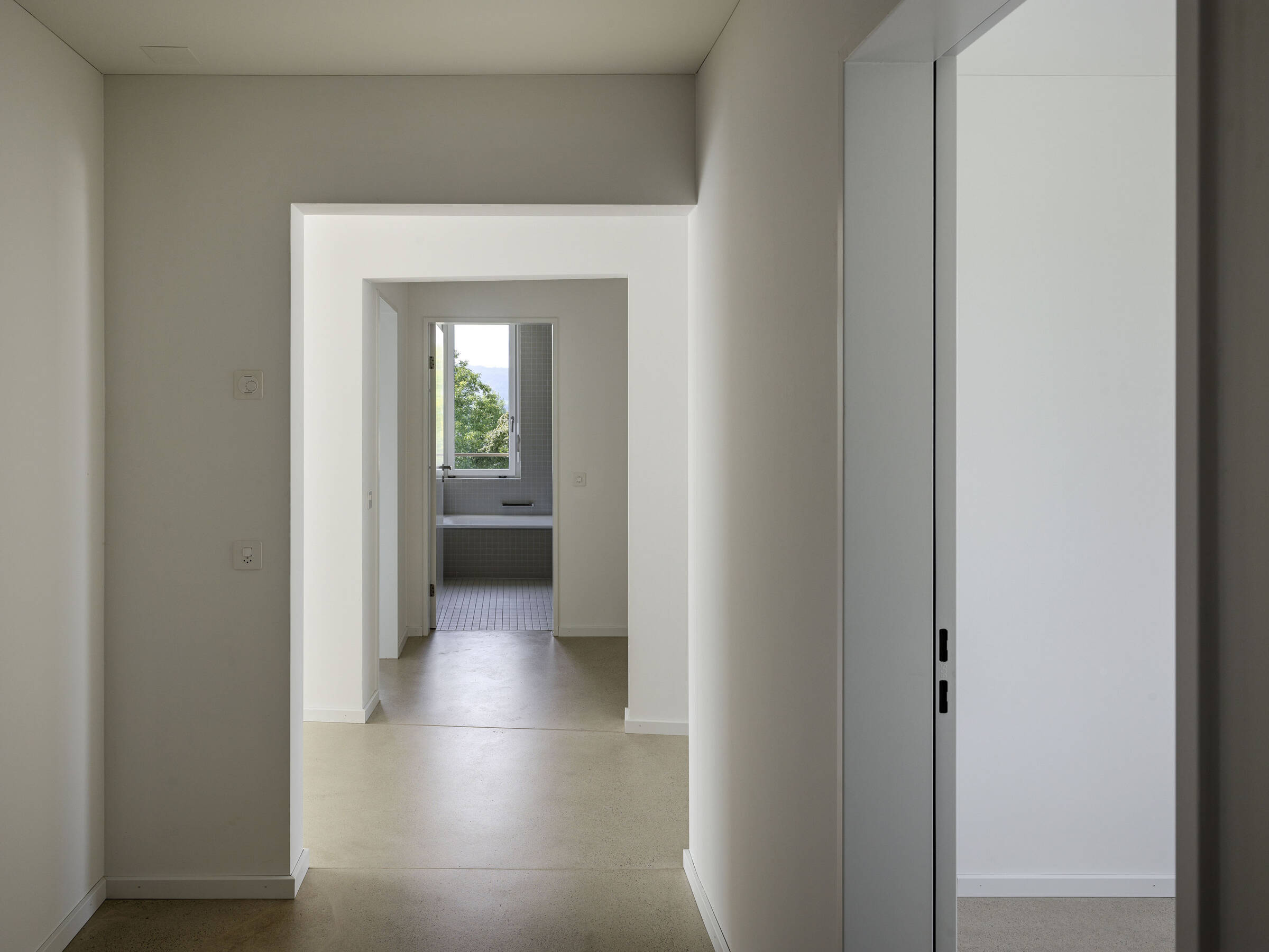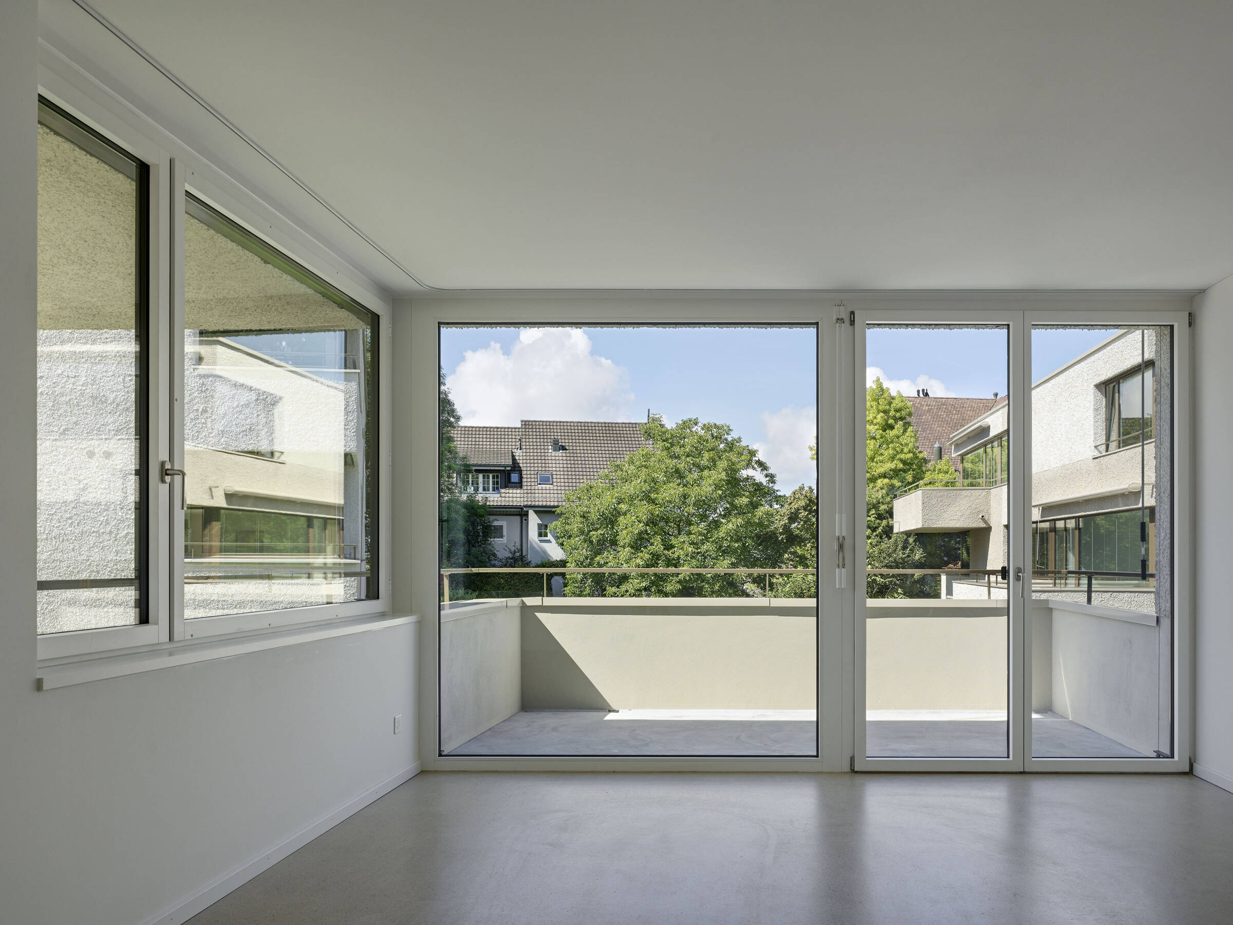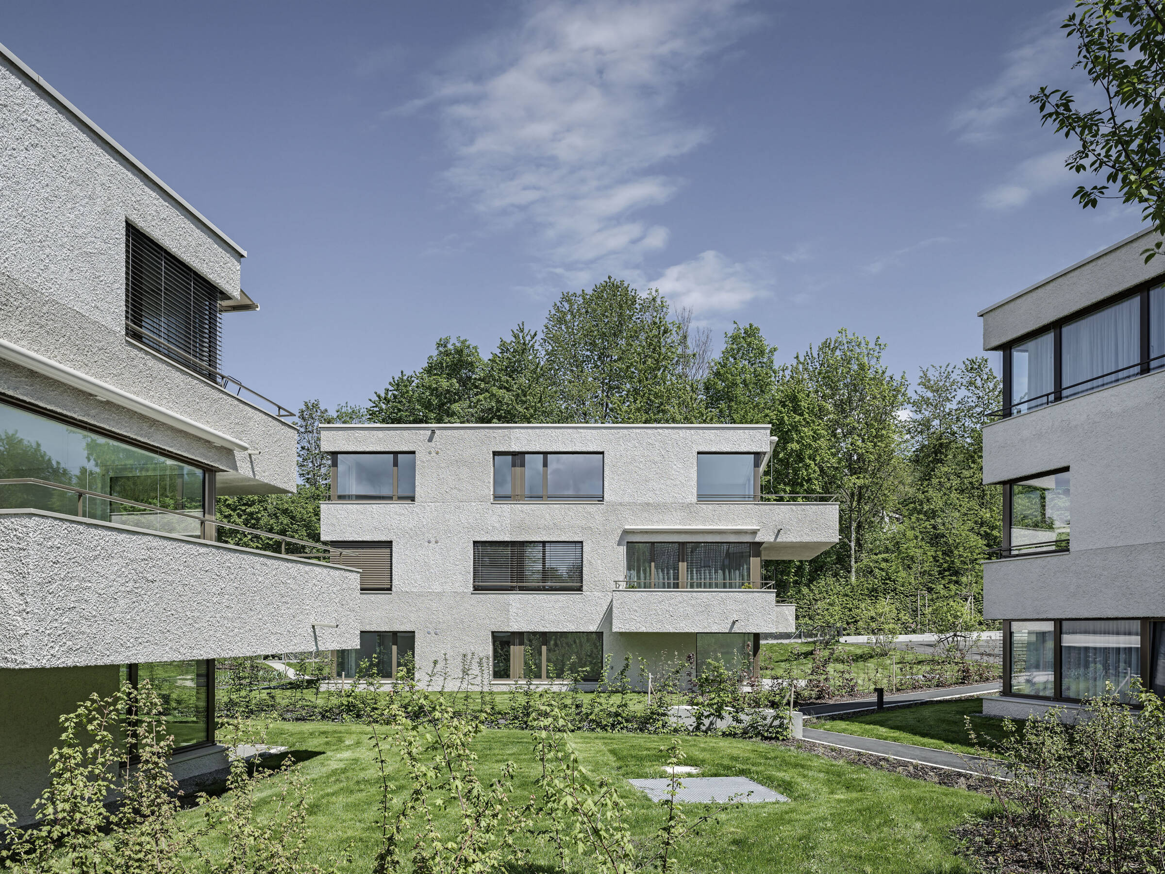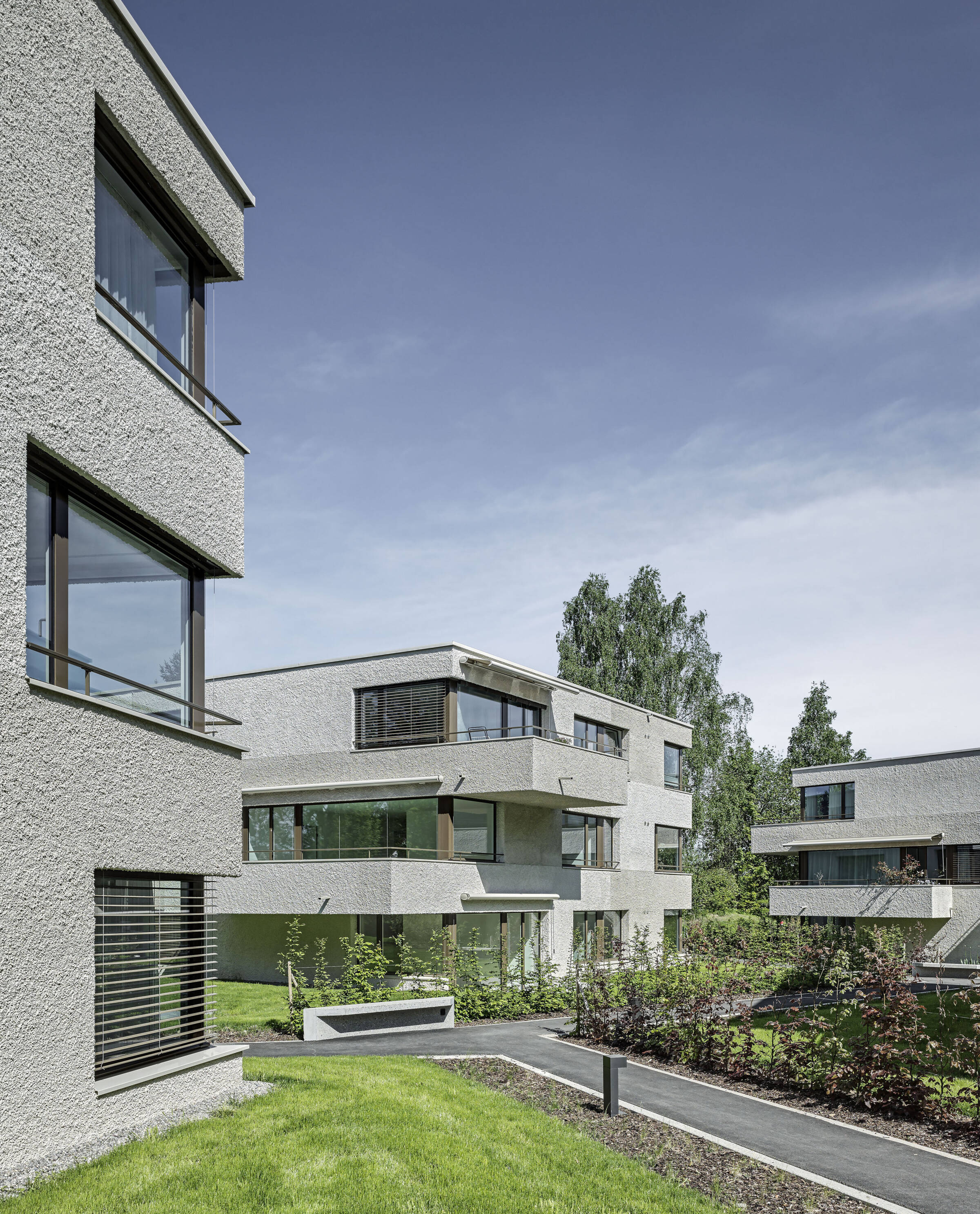 In einem spannenden Wechselspiel von Dichte und Offenheit verwebt sich die Überbauung mit dem angrenzenden Landschaftsraum und verleiht dem Ort eine spezifische Identität. Die Häuser verfügen über einen einladenden Eingangsbereich, der zu den optimal ausgerichteten Wohnungen führt. Diese bieten durch ihre dreiseitige Orientierung und geschickte Anordnung vielfältige Raumerlebnisse: Grosszügige Raumfluchten mit Aussichten wechseln sich mit introvertierten Individualzonen ab.