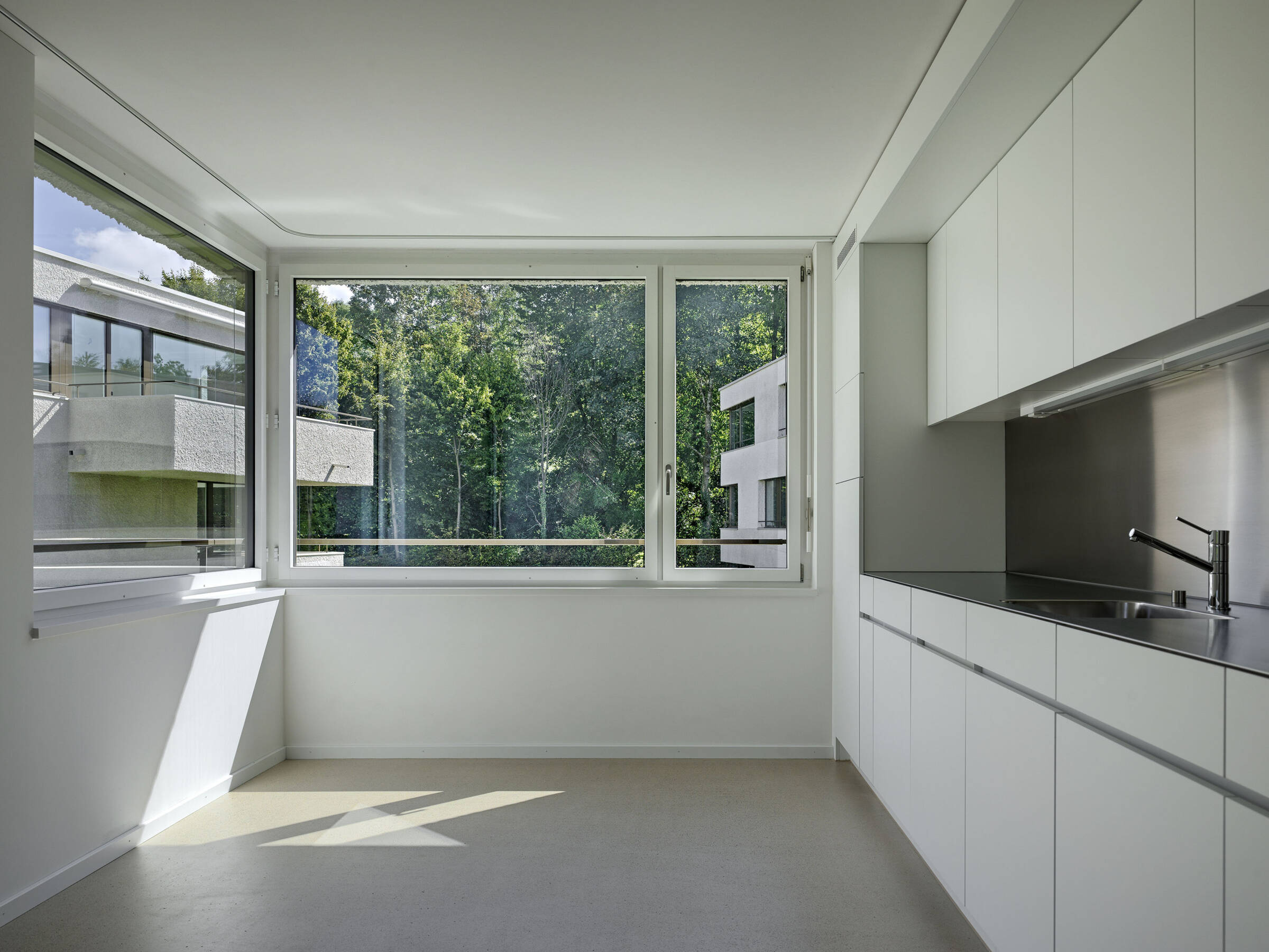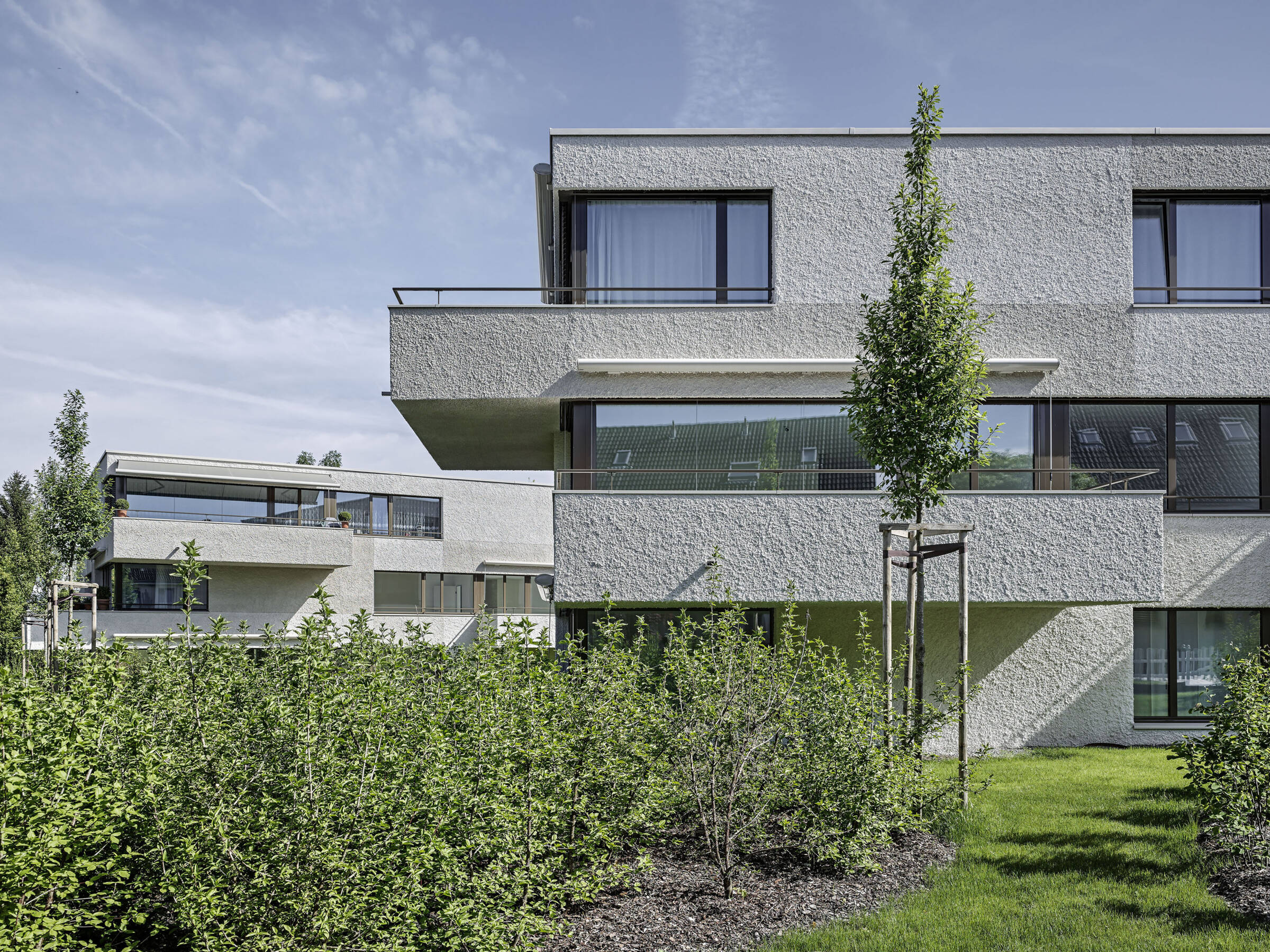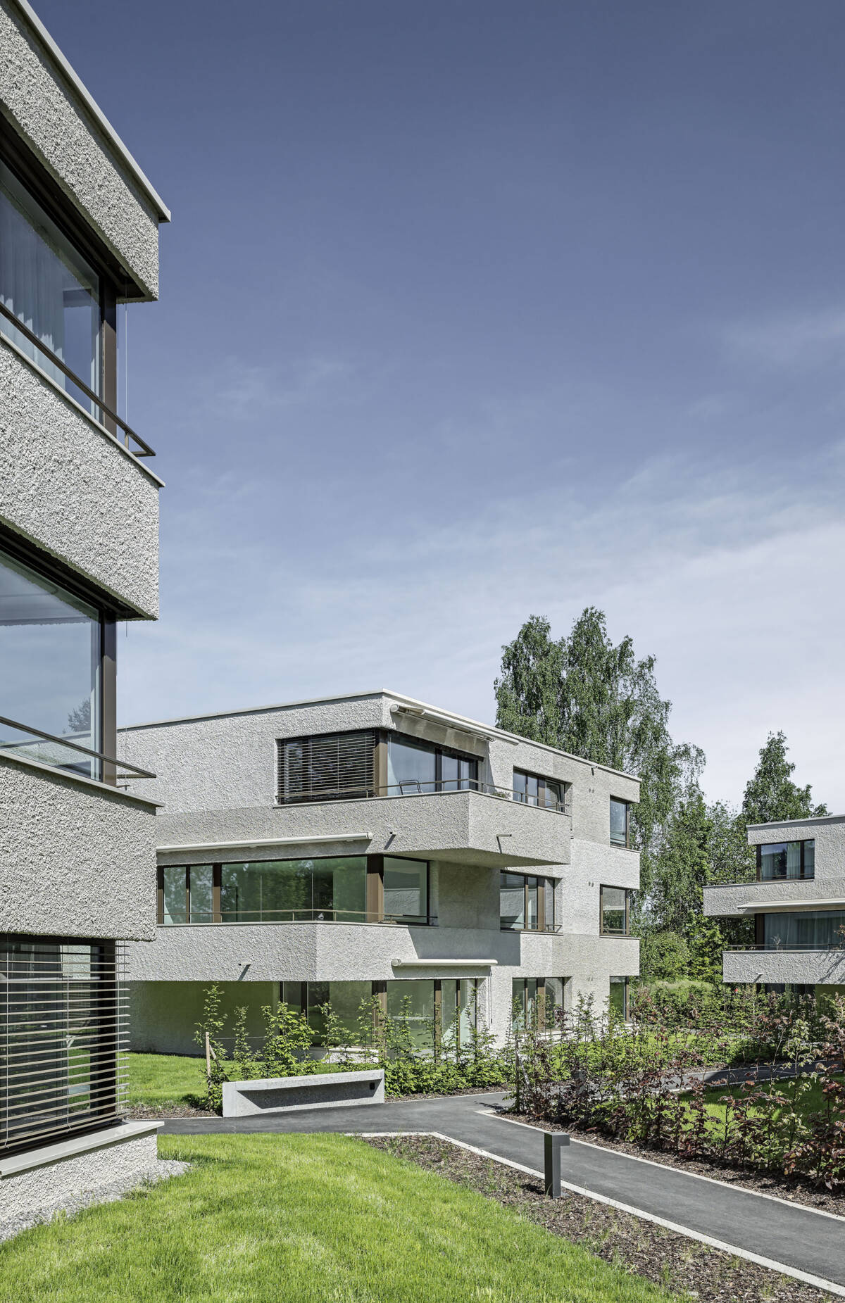 In einem spannenden Wechselspiel von Dichte und Offenheit verwebt sich die Überbauung mit dem angrenzenden Landschaftsraum und verleiht dem Ort eine spezifische Identität. Die Häuser verfügen über einen einladenden Eingangsbereich, der zu den optimal ausgerichteten Wohnungen führt. Diese bieten durch ihre dreiseitige Orientierung und geschickte Anordnung vielfältige Raumerlebnisse: Grosszügige Raumfluchten mit Aussichten wechseln sich mit introvertierten Individualzonen ab.