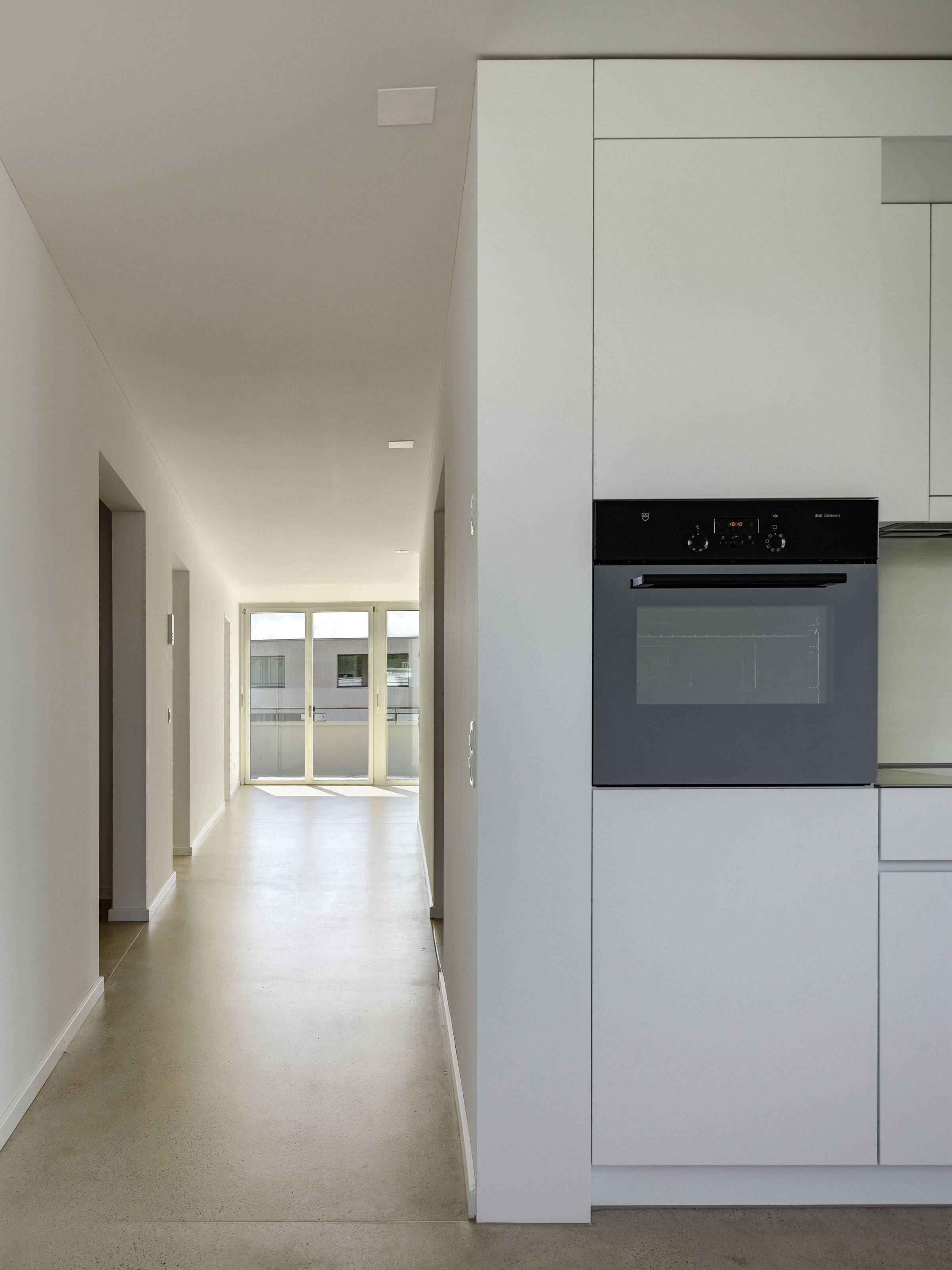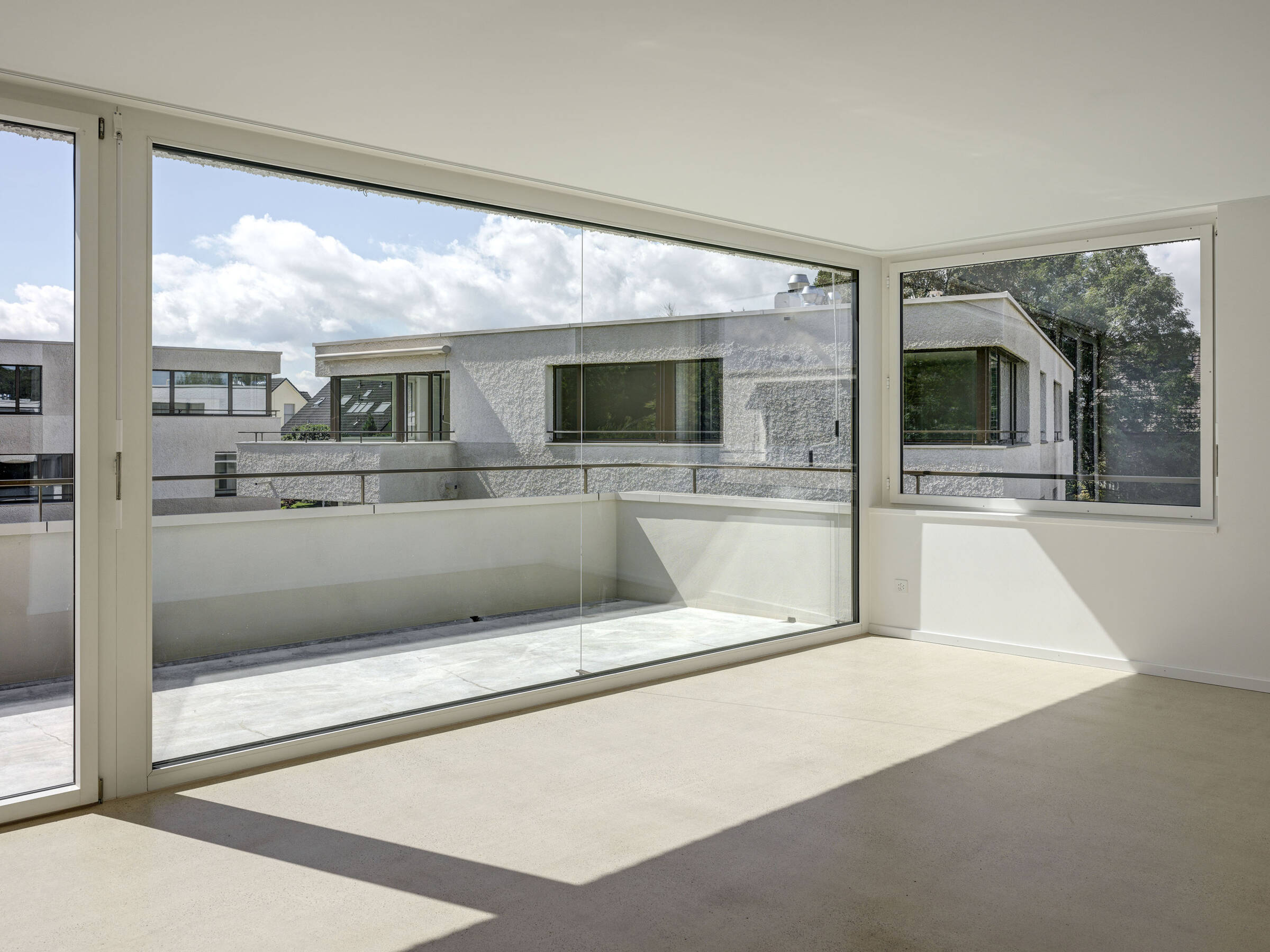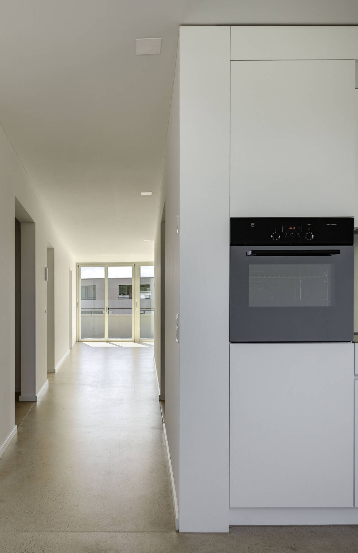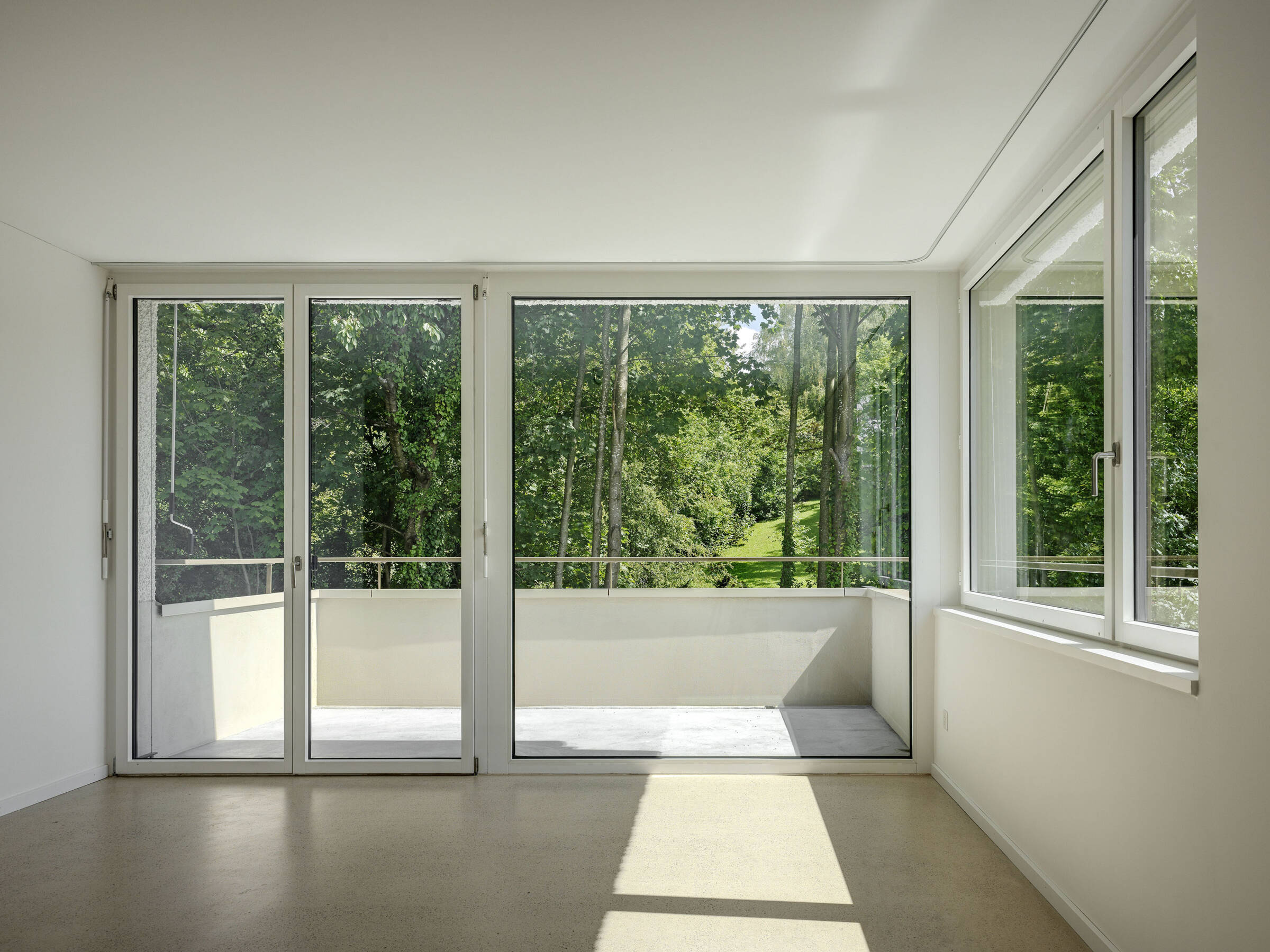 In einem spannenden Wechselspiel von Dichte und Offenheit verwebt sich die Überbauung mit dem angrenzenden Landschaftsraum und verleiht dem Ort eine spezifische Identität. Die Häuser verfügen über einen einladenden Eingangsbereich, der zu den optimal ausgerichteten Wohnungen führt. Diese bieten durch ihre dreiseitige Orientierung und geschickte Anordnung vielfältige Raumerlebnisse: Grosszügige Raumfluchten mit Aussichten wechseln sich mit introvertierten Individualzonen ab.