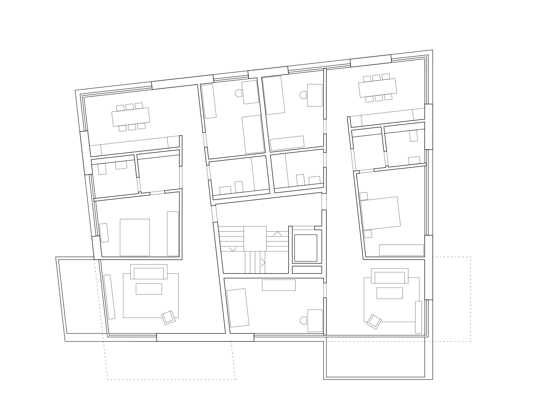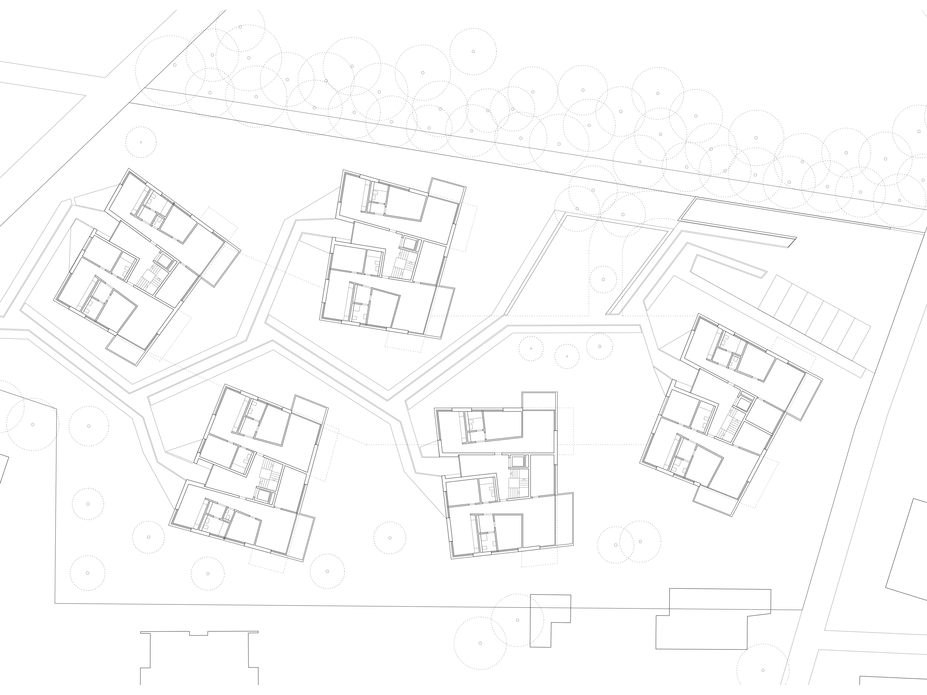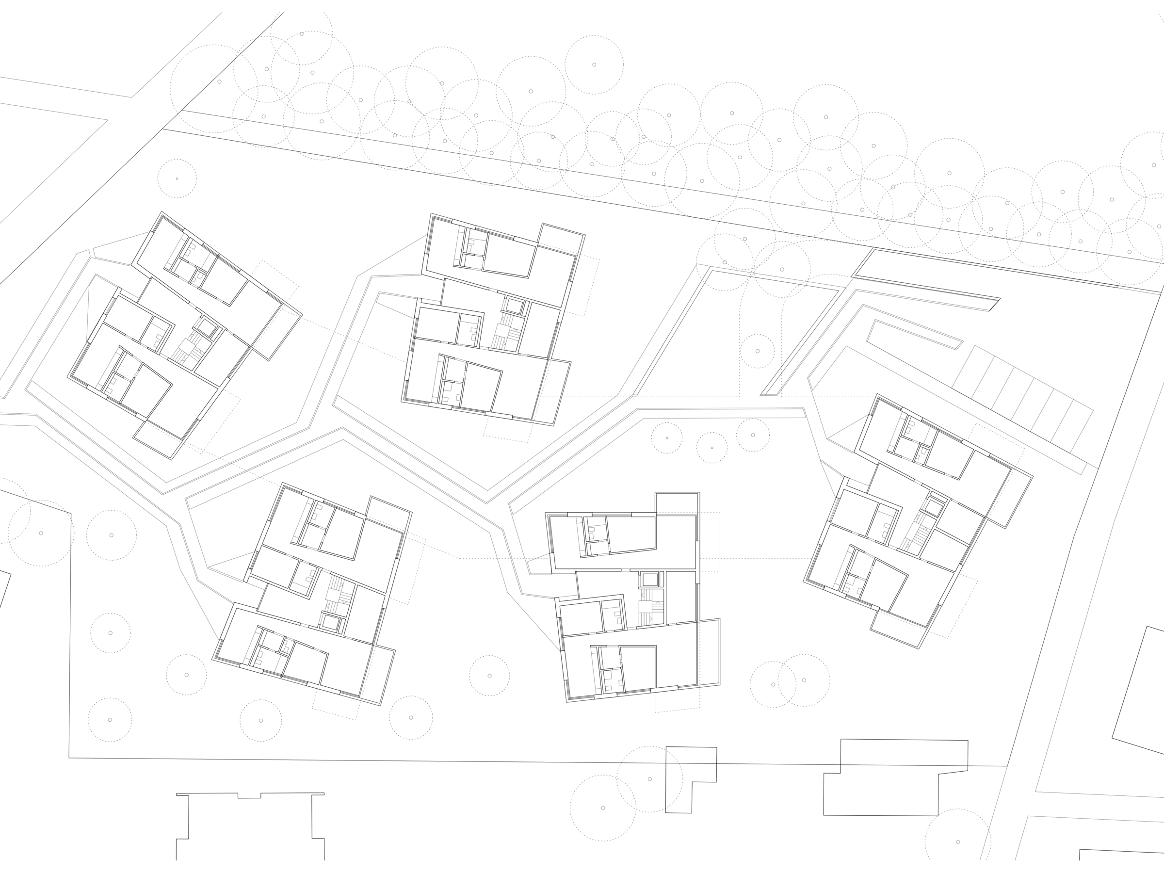 Mit der Überbauung einer gemeindeeigenen Parzelle fördert die Seegemeinde Erlenbach die soziale und altersmässige Durchmischung der ortsansässigen Bevölkerung. Das Areal Sandfelsen befindet sich am Rande des Siedlungsgürtels und am Übergang von der Wohn- zur Landwirtschaftszone. Die neue Überbauung verteilt sich auf fünf Baukörper und fügt sich als lose Komposition ganz selbstverständlich in das bauliche Umfeld ein. Die volumetrische Disposition der zueinander ausgedrehten, trapezförmigen Gebäude generiert einen dynamischen Siedlungsraum mit fliessenden Aussenräumen.