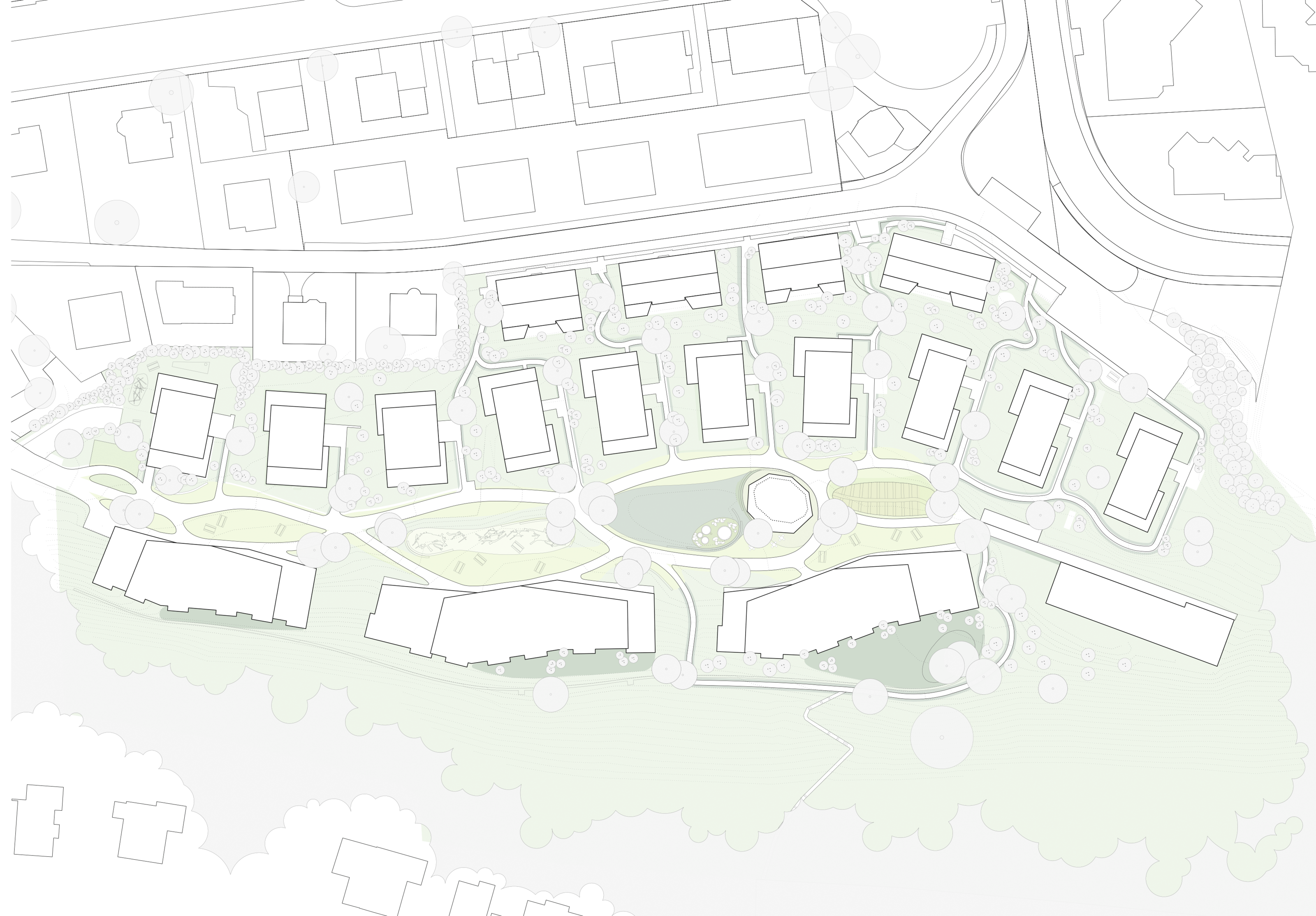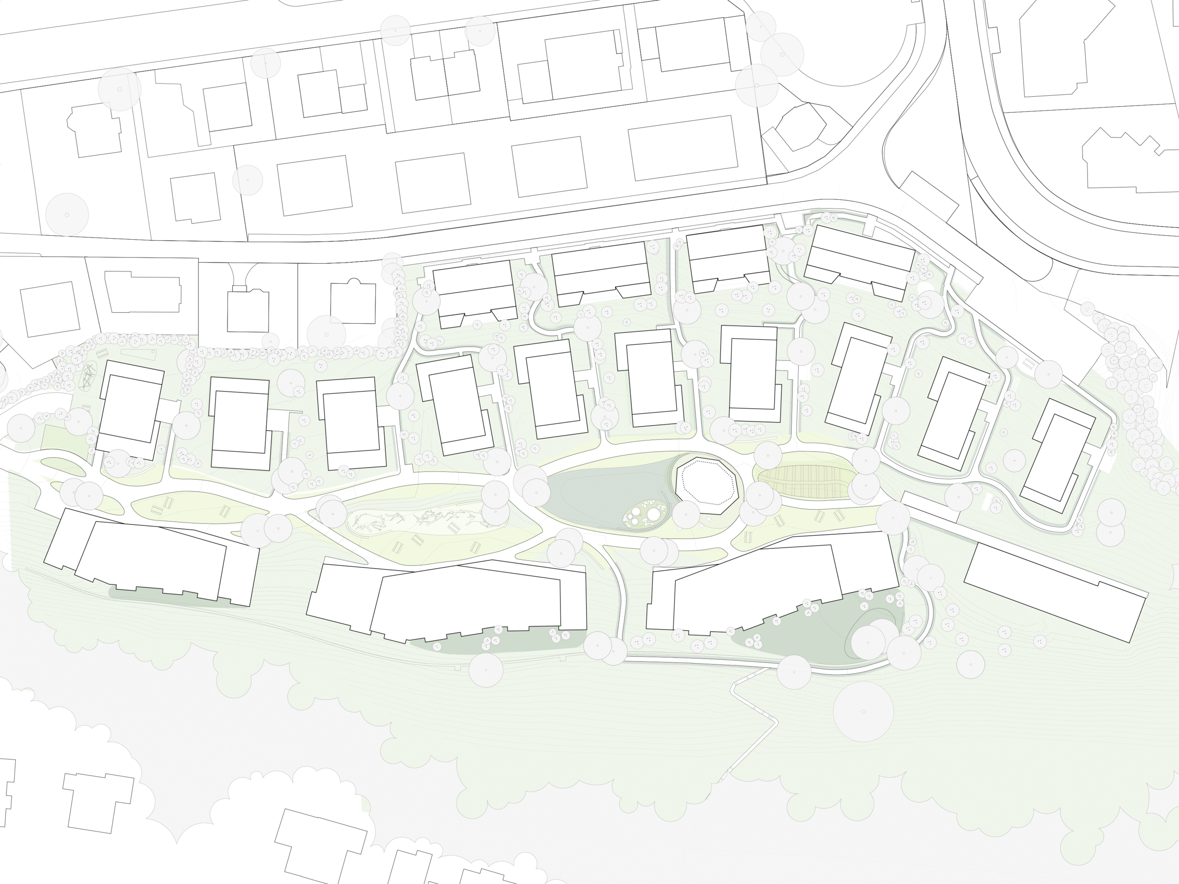 Durch leichtes Knicken der Fassadenfluchten werden die Gebäudelängen gebrochen und der Aussenraum selbstverständlich strukturiert. Es entsteht ein neuer grosszügiger Freiraum, welcher die gesamte Siedlung und deren Identität prägt. Das neue Sockelgeschoss der Neubauten nimmt den Terrainsprung auf und bietet attraktive Flächen für die gemeinschaftlichen Räume, welche sich zum neuen Freiraum orientieren. Sämtliche Wohnungen verfügen über einen Wohn- Essbereich, welcher sich auf die ganze Gebäudetiefe als Raumfigur mit Nord- und Südausrichtung erstreckt und so von der zweiseitigen Ausrichtung profitiert.