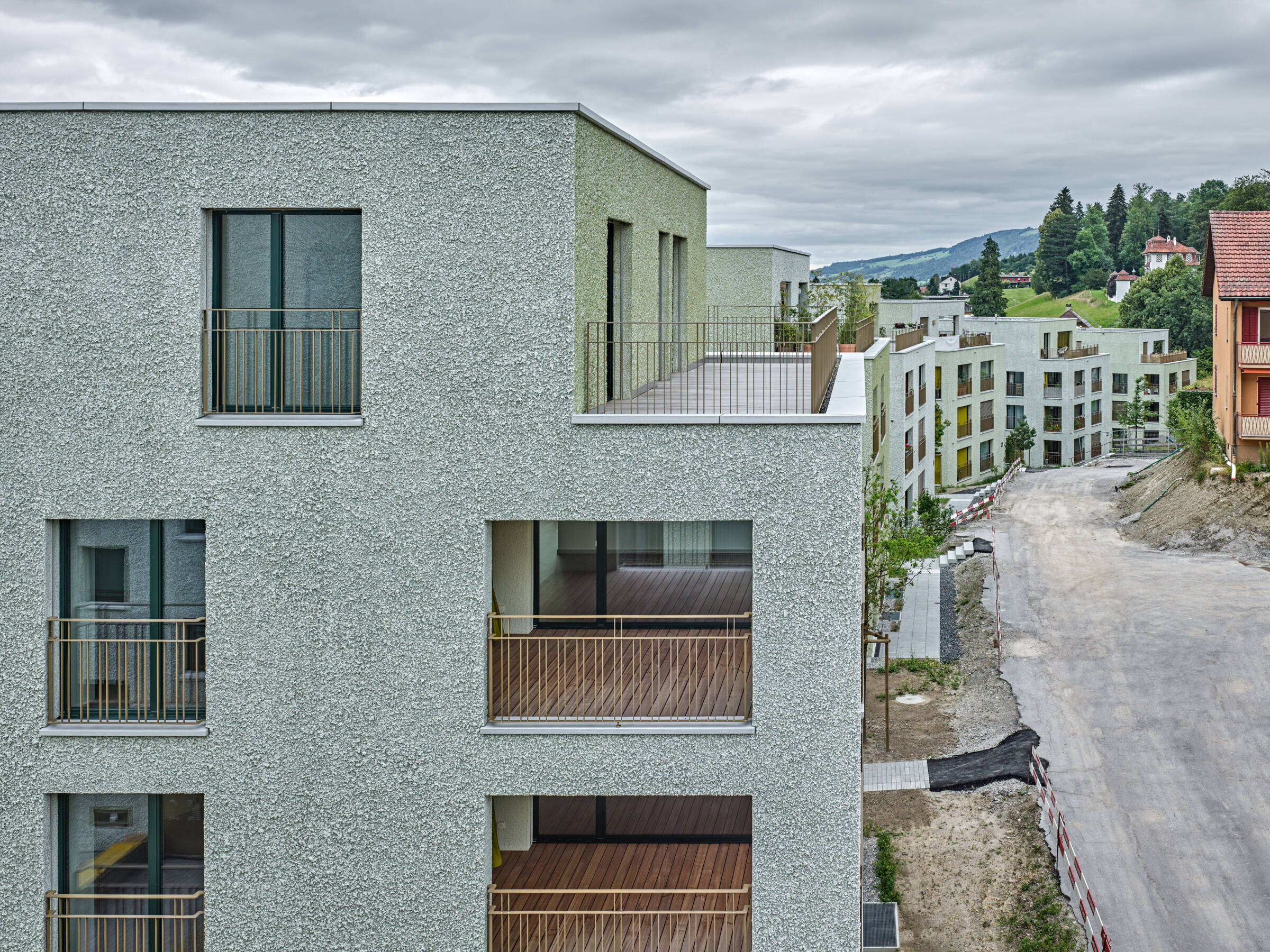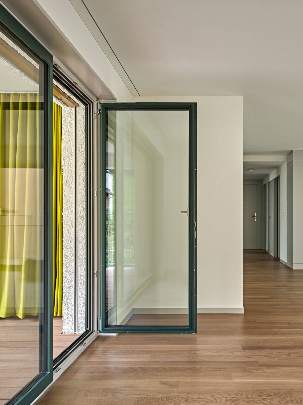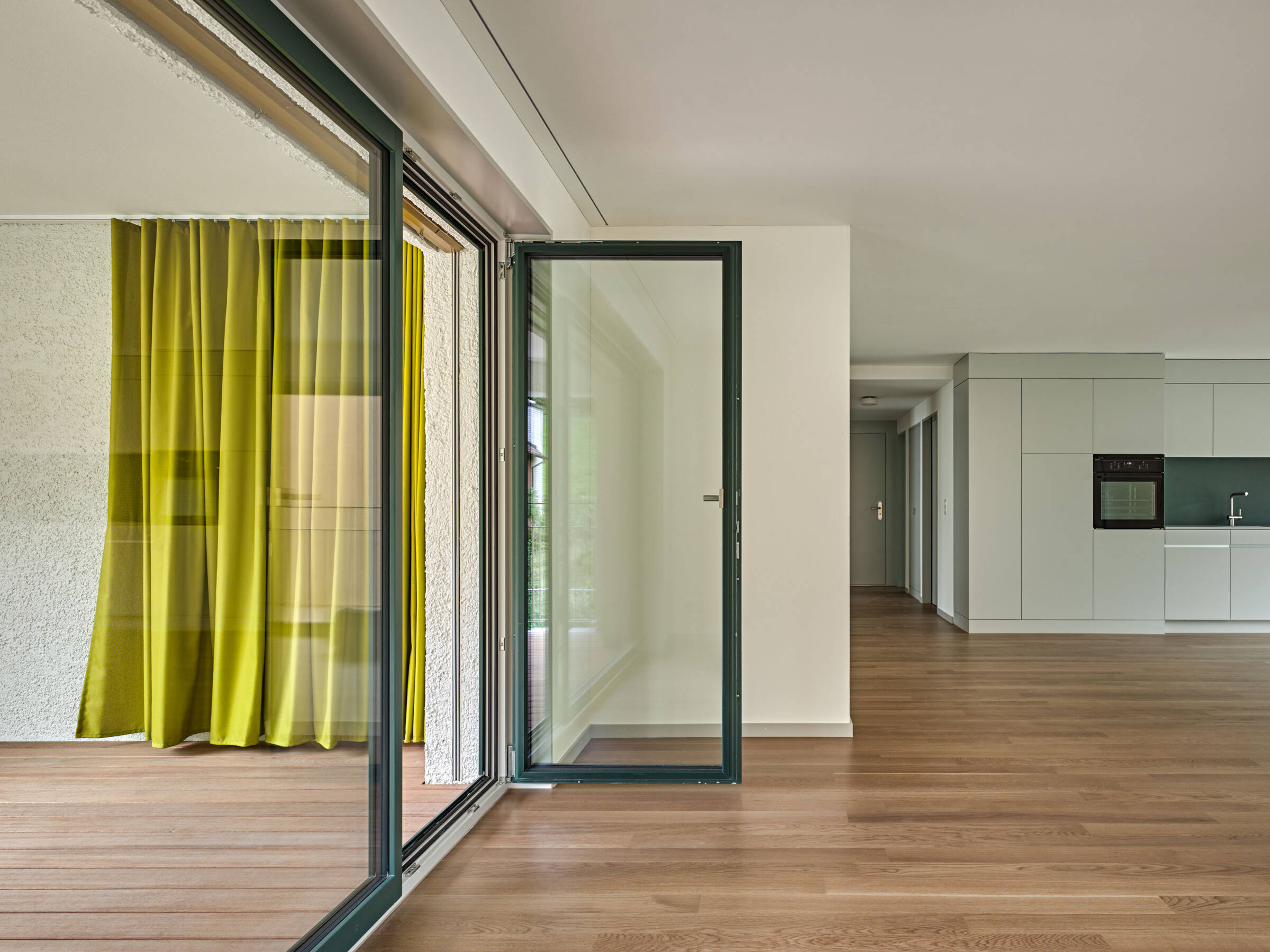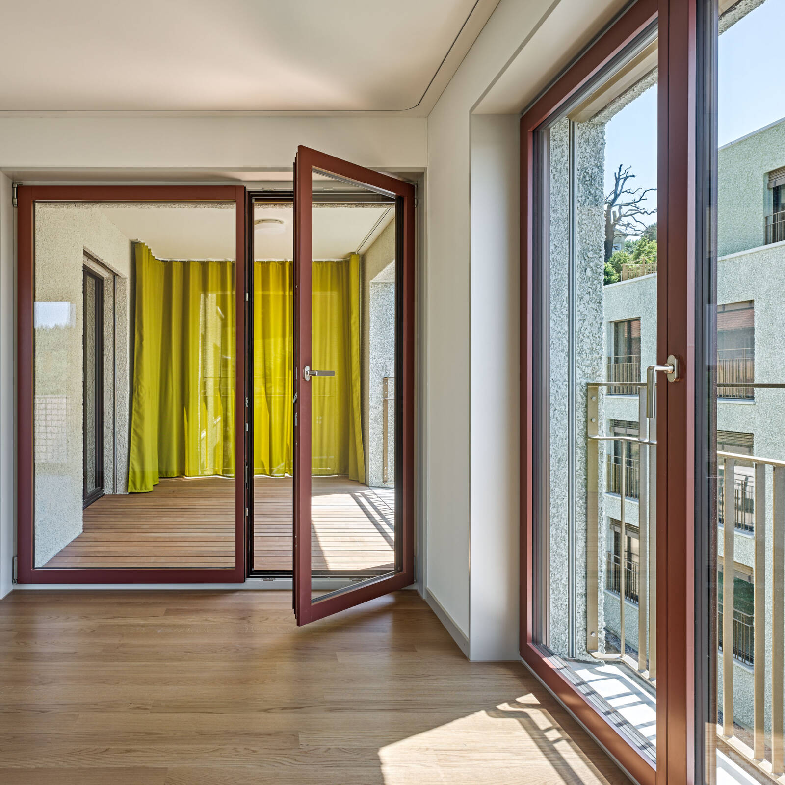 Sämtliche Wohnungen verfügen neu über französische Balkonfenster, die viel Licht in die Wohnungen bringen und den Bezug zum Aussenraum stärken. In der grob verputzten Fassade wechseln sich farblich unterschiedlich gestaltete Flächen entsprechend einem Gestaltungsraster ab und betonen die verschränkte Gebäudegrundform.