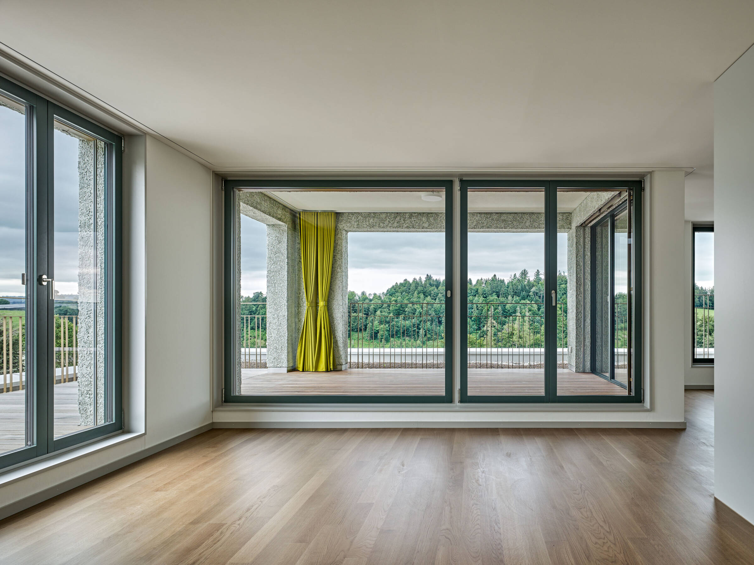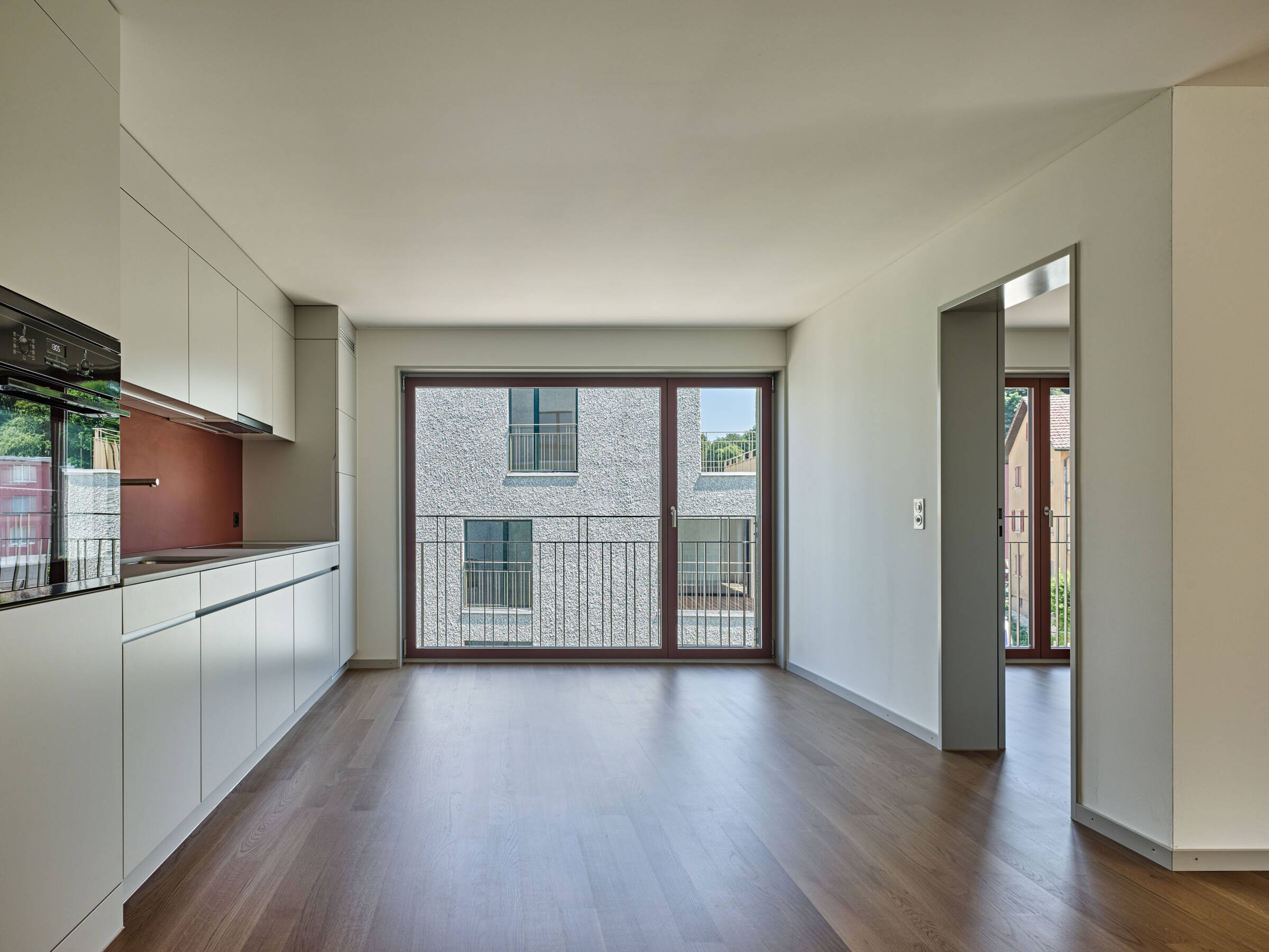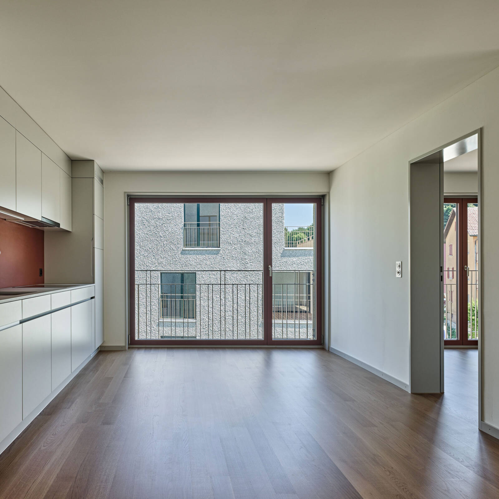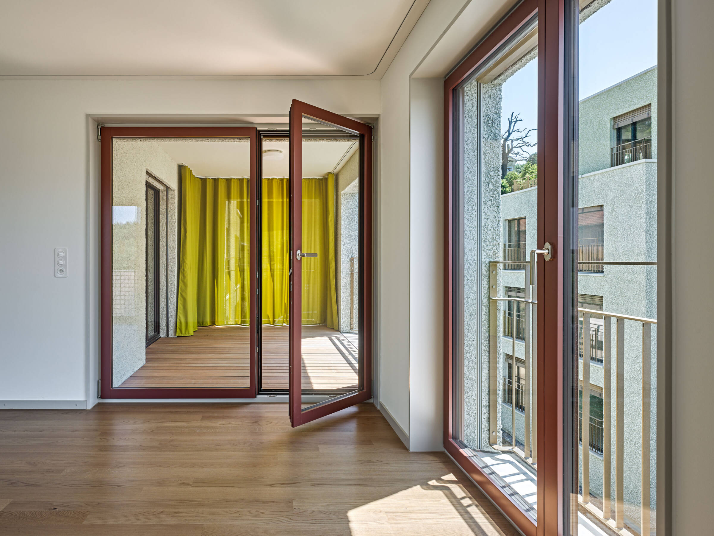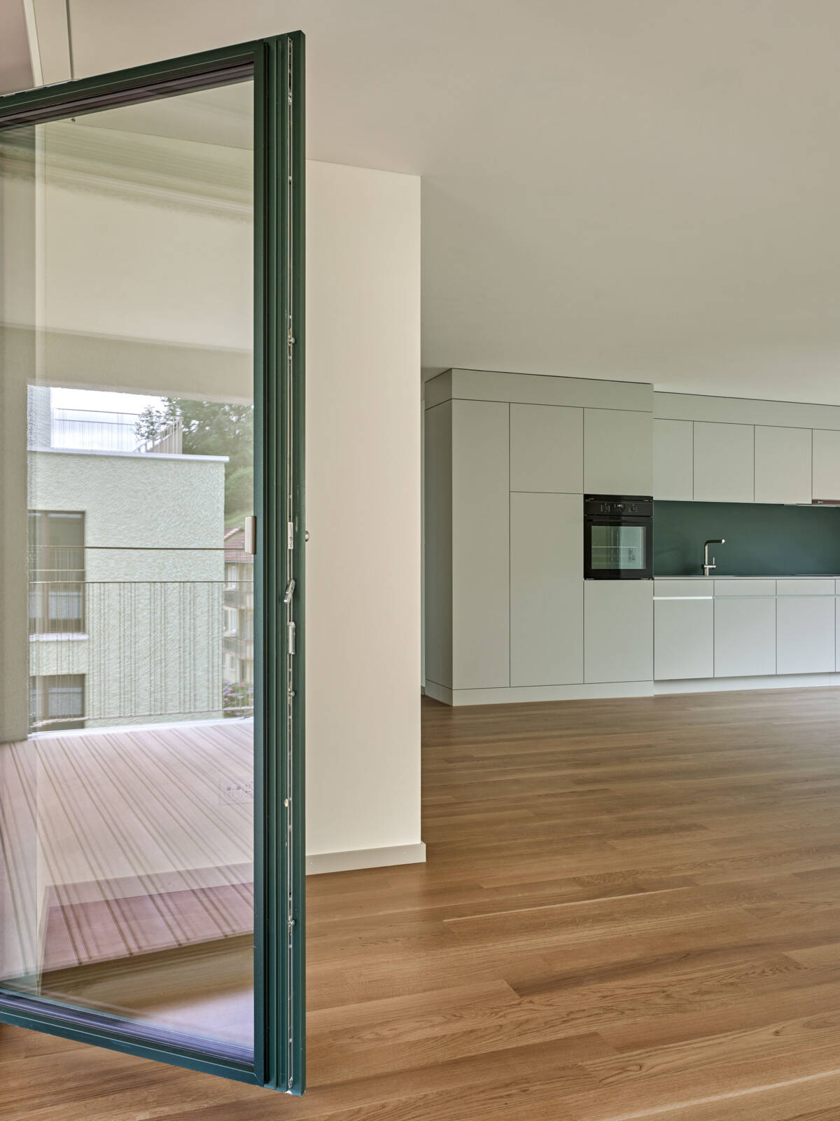 Sämtliche Wohnungen verfügen neu über französische Balkonfenster, die viel Licht in die Wohnungen bringen und den Bezug zum Aussenraum stärken. In der grob verputzten Fassade wechseln sich farblich unterschiedlich gestaltete Flächen entsprechend einem Gestaltungsraster ab und betonen die verschränkte Gebäudegrundform.