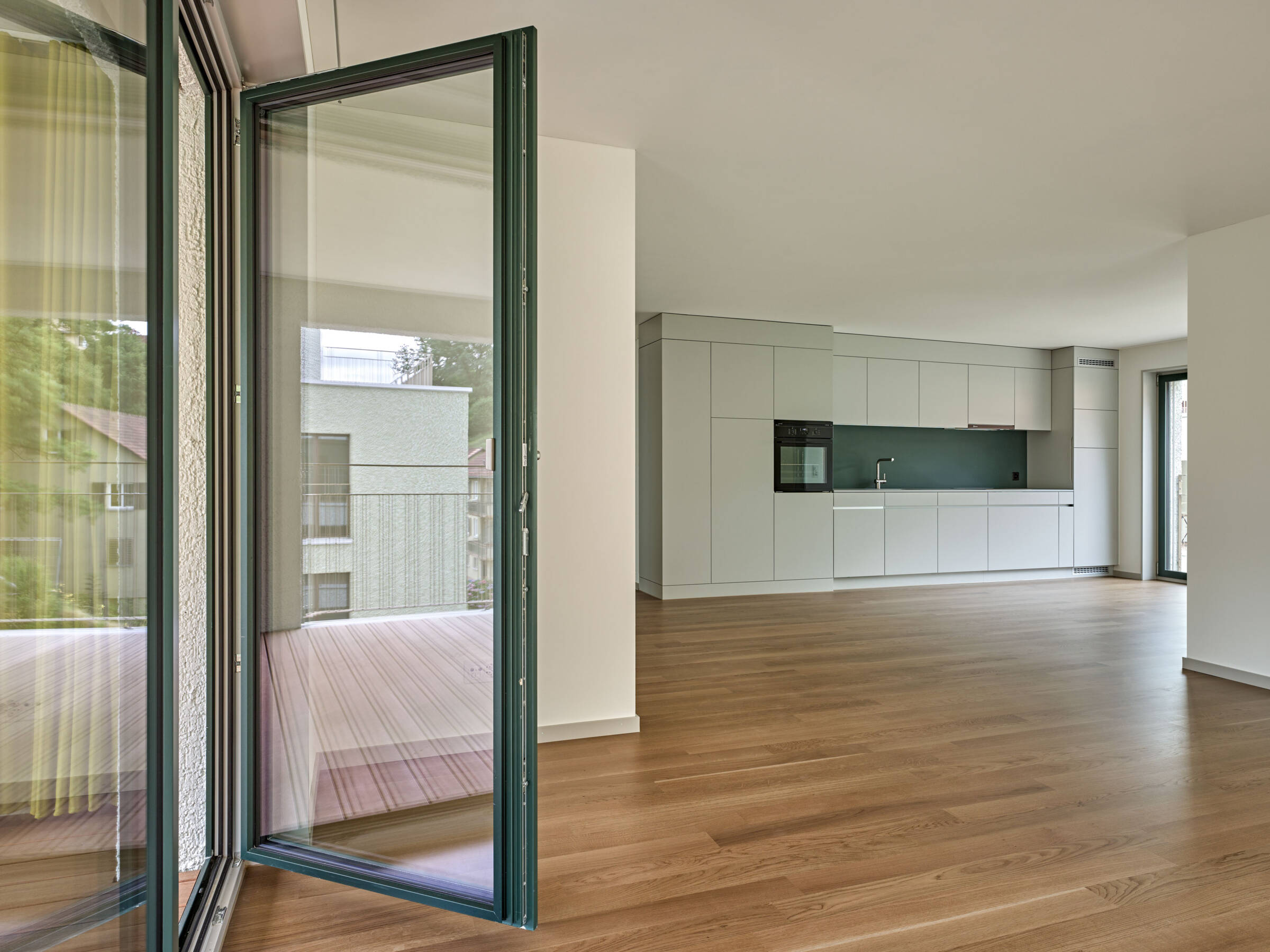 Die daraus resultierende Verzahnung der Gebäude mit dem Aussenraum ermöglicht neu allen Wohnungen einen grosszügigen Wohnraum mit angrenzender Loggia und direktem Blick in den neuen Siedlungsraum. Das Satteldach entfernt und ein Attikageschoss in Holzbauweise mit Flachdach ergänzt. Die Gebäudehülle sowie die gesamte Haustechnik wurde erneuert und den heutigen Anforderungen angepasst.